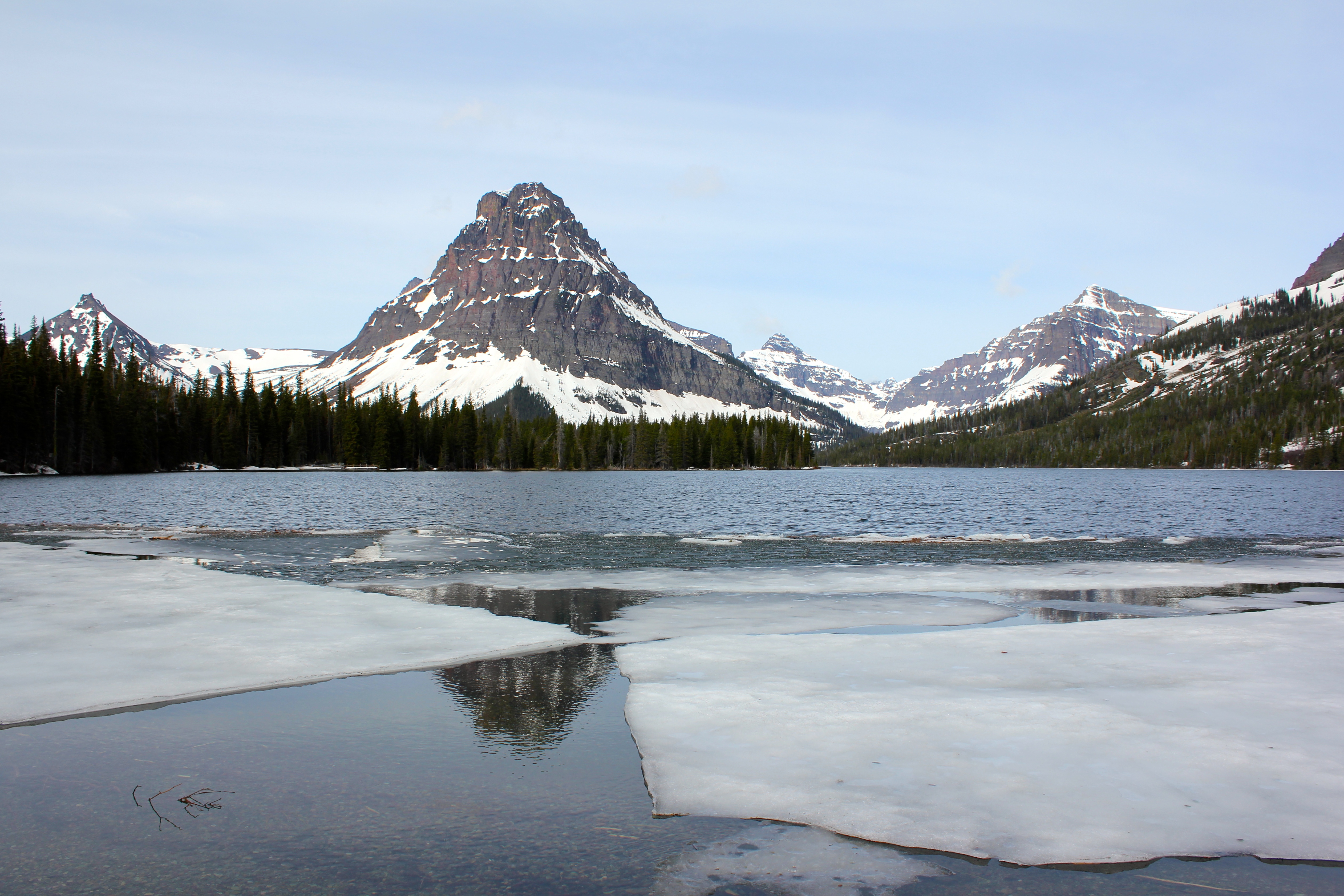 Outside of the park we stop by the river so that Caleb can get the dogs two gallons of glacial water and give his hands some shock therapy. Piggy and I stand in the grass while Sparky climbs on the rocks to supervise. We drive farther south to another park entrance, Two Medicine, and hike half in mud, half snow on the Running Eagle Falls Nature Trail until Caleb slips and I almost fall from laughing. The falls are named after the only Pikuni woman to have a successful vision and spend her 30 years of life being an inspiration.
