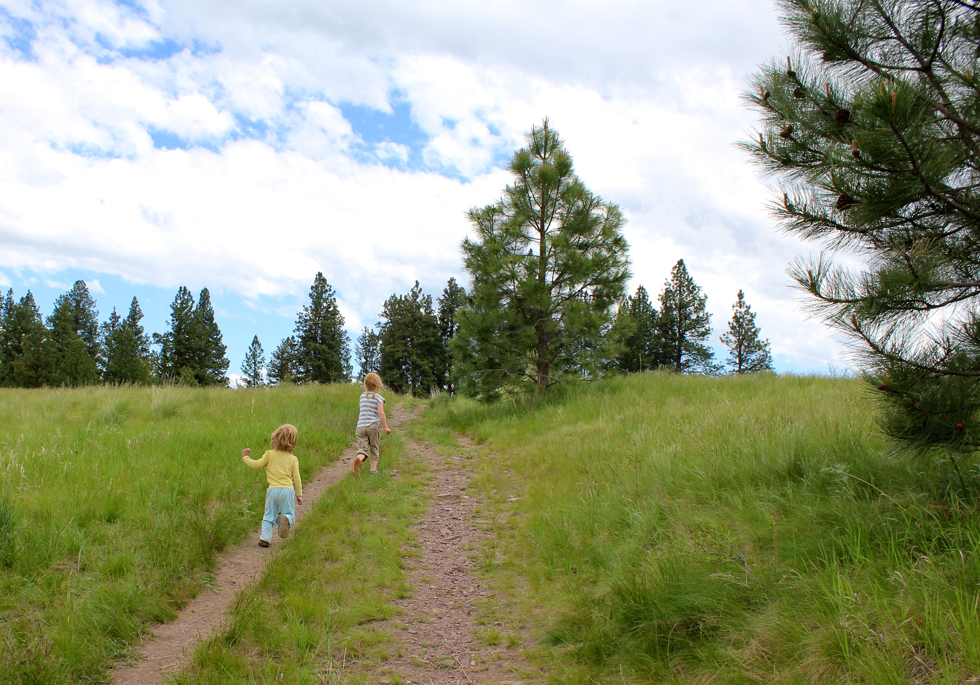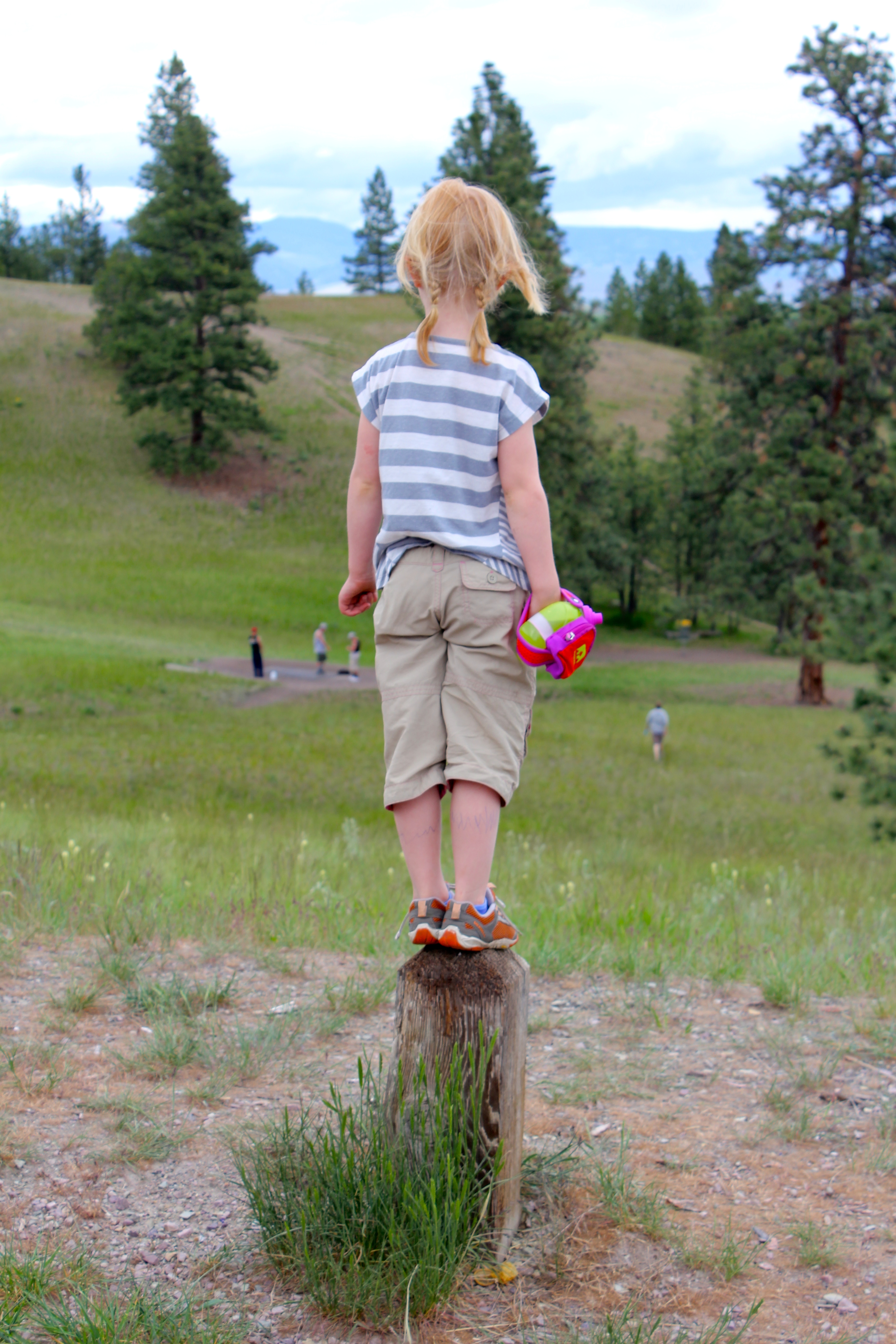 We drive to Lolo where there is a buffalo ranch nearby to show the girls how close bison can live to the city, but their usual location is flooded, so Jessi and Caleb stand near the railing staring off into the distance as if they were just selected for The Hunger Games before deciding that we can come back and look some more after our hike at the East Area of Blue Mountain. Jake brought his bag of frisbees and the guys have fun throwing them for the girls through an official course – through trees and over hills – practice and play at the same time.