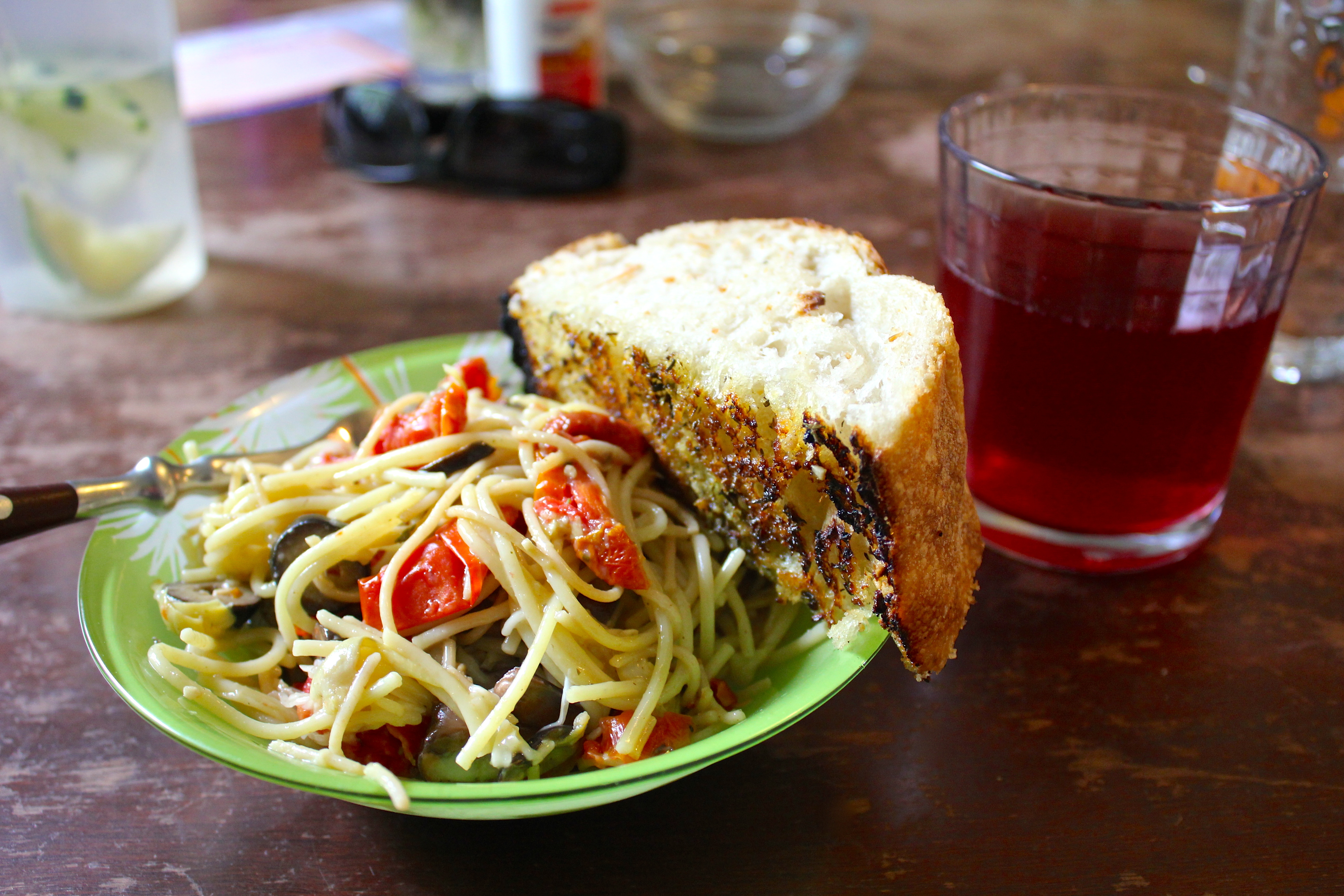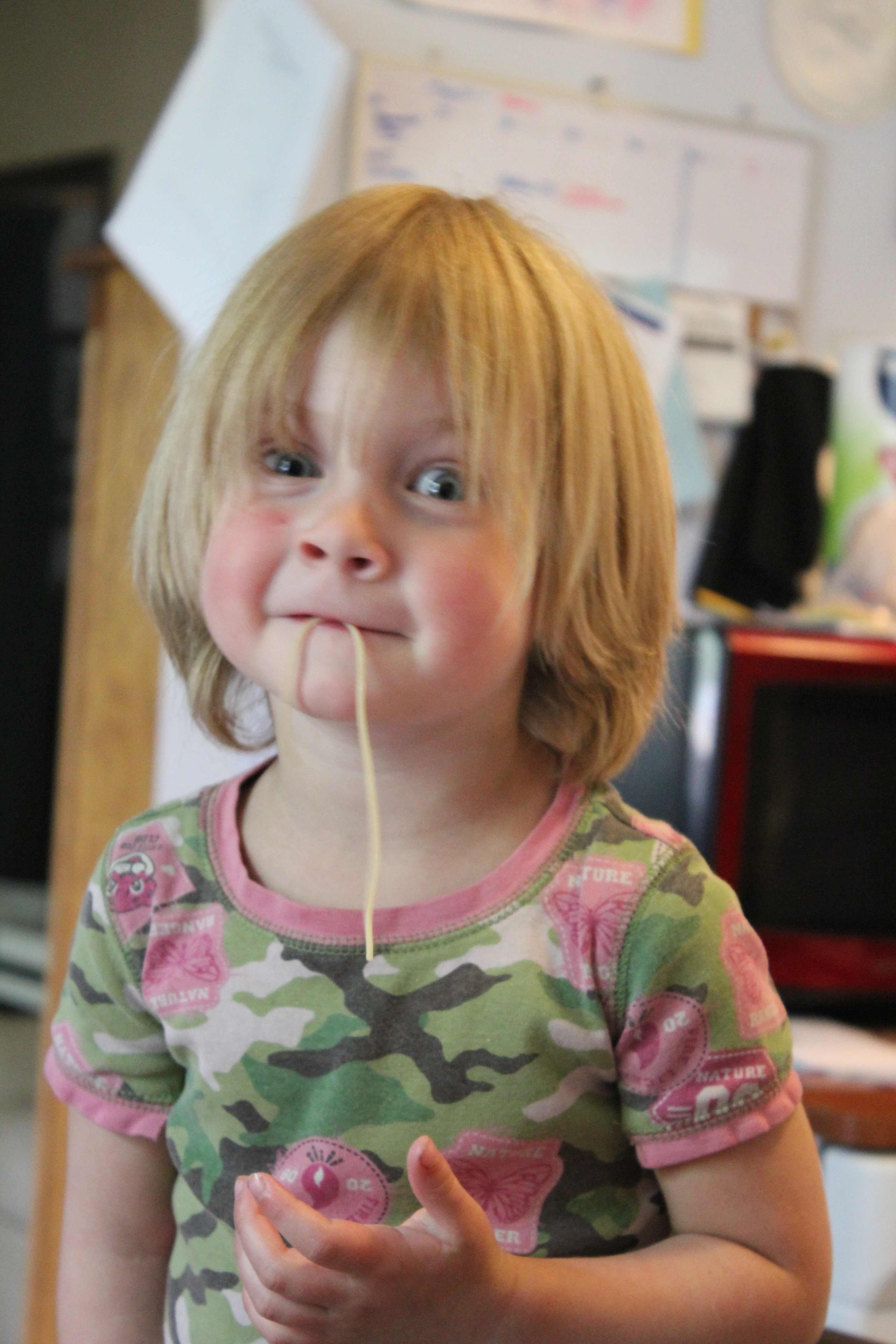 When I got up Lyra was eating Cheerios and putting gloves on her feet. I had some leftover oatmeal with peanut butter and Caleb decided to wear his nuts instead of eat them. The nieces seem to bring out his inner child. We made a shopping list – flax-seed for waffles and whatever we wanted for dinner. We went to the Good Food Store with Robert and decided on Italian spaghetti – sundried tomatoes, artichoke hearts, and olives, with parmesan cheese, noodles, and minced garlic from Robert’s, with eggs and mushrooms from his fridge. We also picked up rice pilaf, refried beans, and a can of chicken from Robert’s to have for lunch.