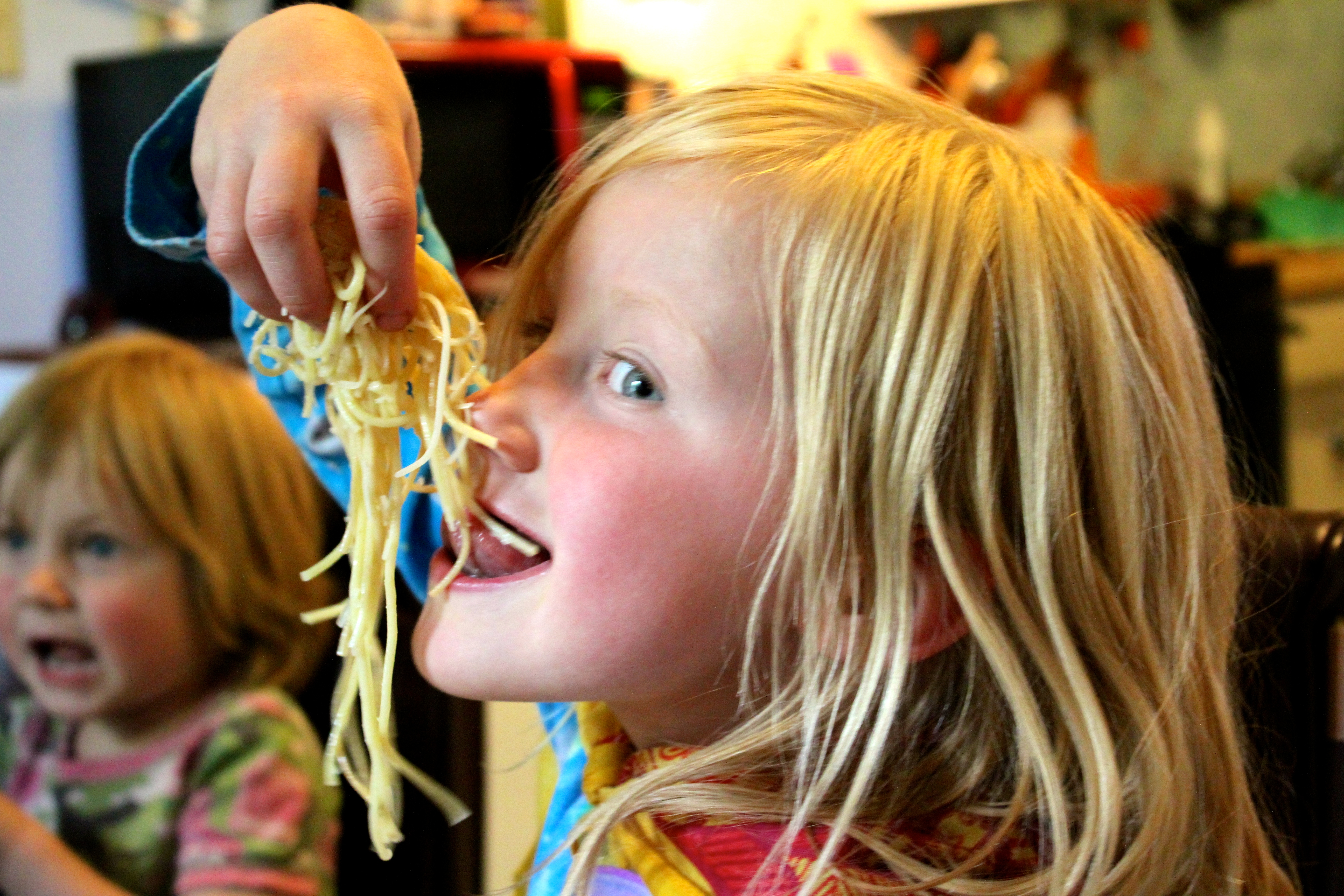Father and son made dinner for the ladies. The girls got buttered noodles with cheese that they pretended were worms and that they were T-rex’s eating them. It takes a lot of worms to fill such a big dinosaur and both had seconds if not thirds. After dinner the girls ‘fished’ (jumped off the couch towards things on the floor – clothes and toys) while we cleaned up the table and kitchen.