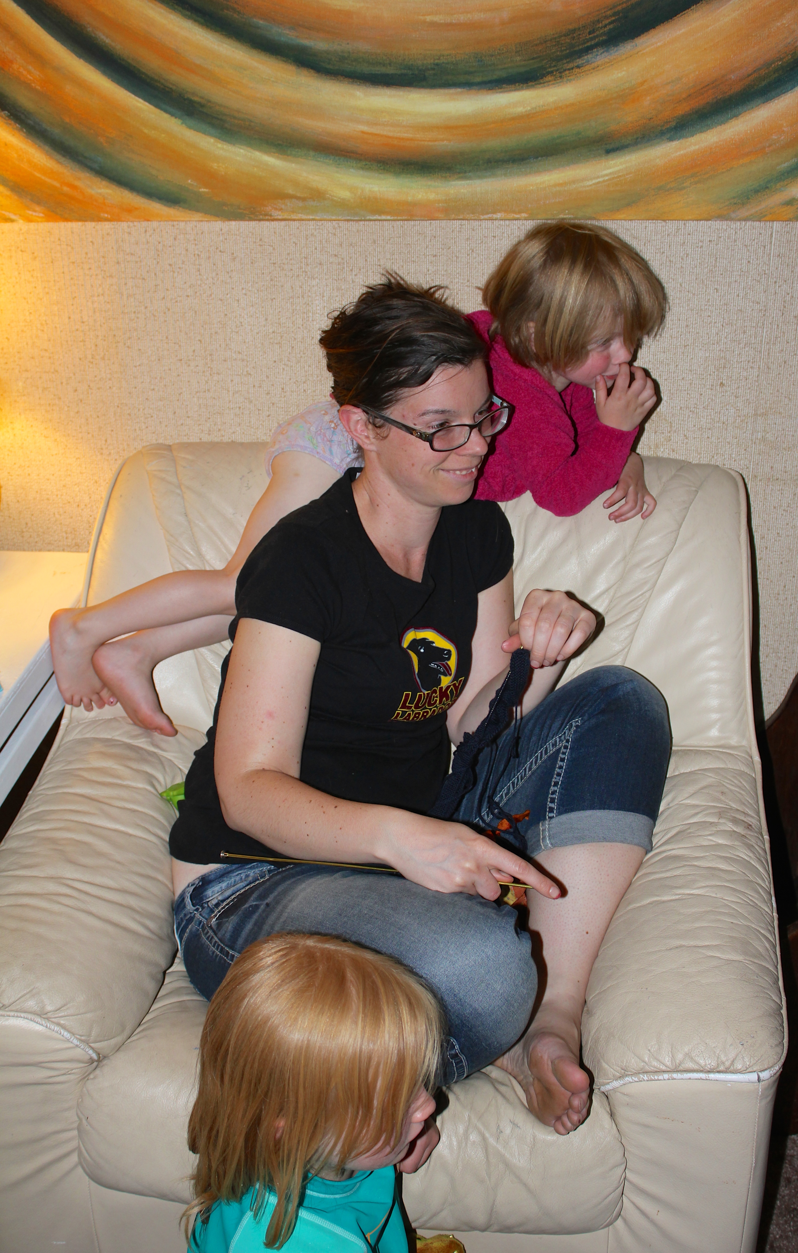 Sammi had two cups of mandarin oranges and might’ve had more if Jessi hadn’t put a limit on them. Alone they can be healthy, but I don’t know how much the syrup offsets that factor. The girls sit all over the place in weird positions – on daddy’s lap, behind mommy on the back of the chair, and on the floor. Jessi gets a bit of knitting done. I know it helps me with movie guilt if I can feel accomplished at the end. The girls brushed their teeth and getting them into bed after 10:30 was no problem. We are all tired.