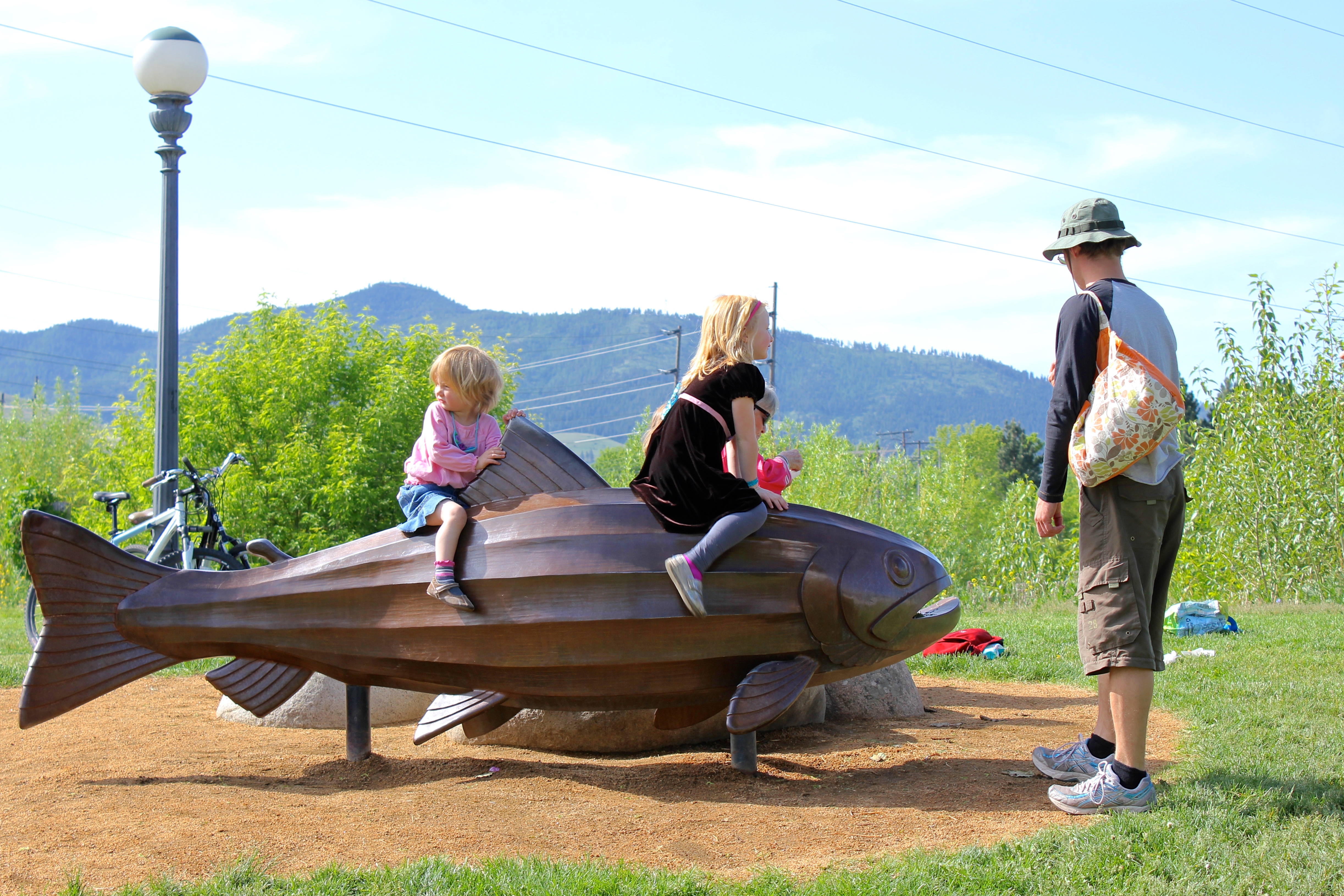 We found Robert a spot in the shade while we waited for the girls to return from their short trek in the forest – a small trail in the park. Jake bought a breakfast burrito sans tortilla to share and we ate while the girls jumped from rock to rock and fought over who would sit on the front of the fish and who would have to sit behind the fin. Had it been me, the argument would’ve been over quickly. I touched the fish and he’d picked up some heat in the hour that we’d been there, but the girls didn’t seem to mind – and neither did the other kids, some just learning to walk, that came into a hazard zone near other kids jumping and kicking and falling about.