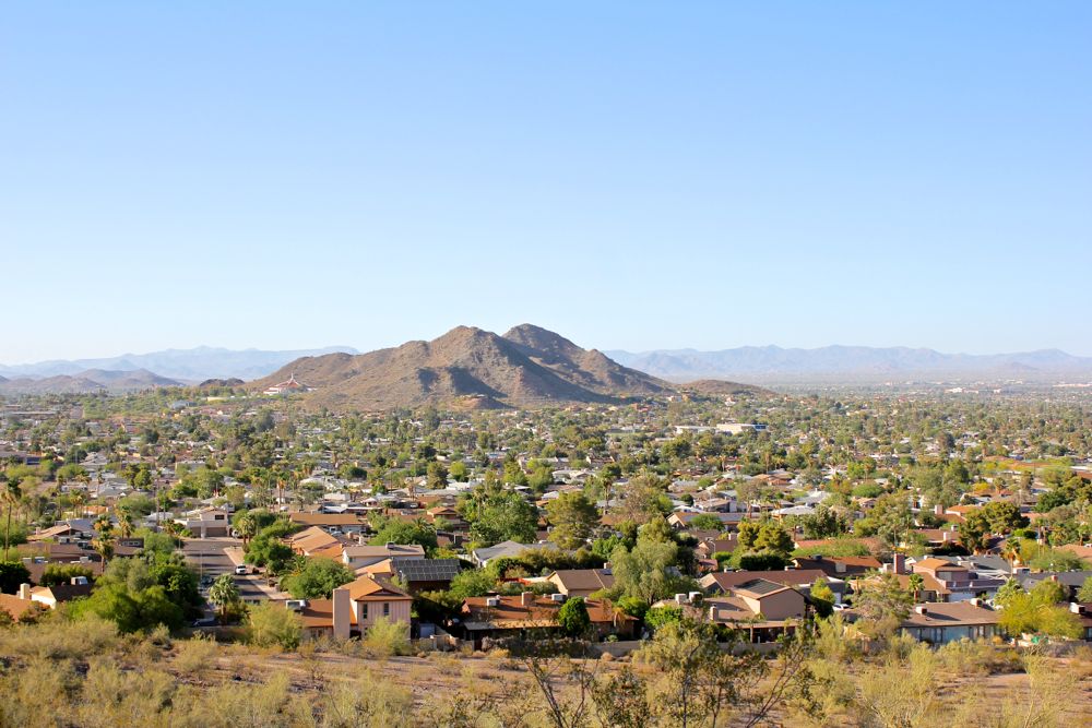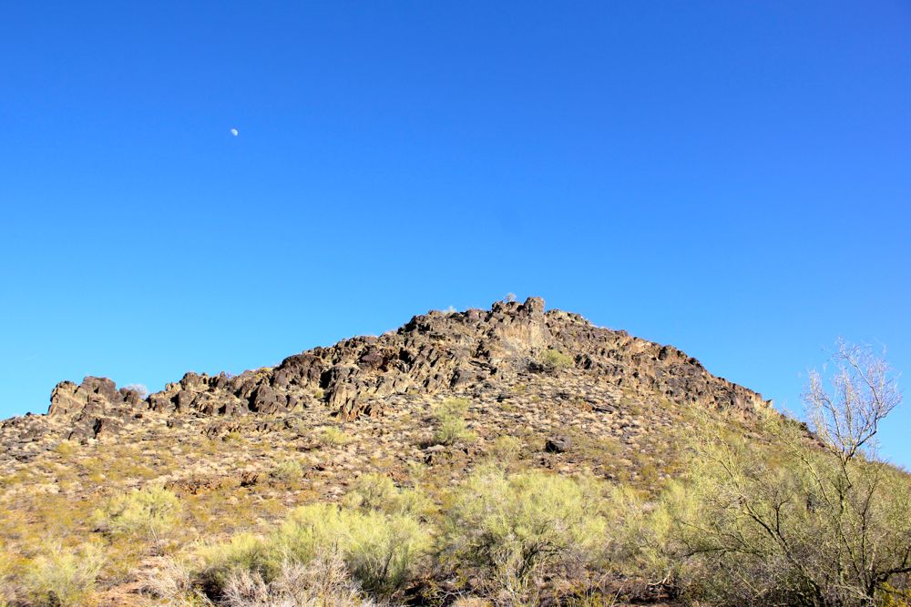 Caleb threw the ball for Sparky a few times and then I noticed Sparky’s left rear foot was bloody and that it was still 103 degrees out. I carried him back to the car, but we weren’t ready to go home yet. We drove down the street, pulled into a neighborhood, and then drove around until we found parking next to a trail sign. The dirt was hot too so I tried to keep the dogs in the shade. They did well. We were looking for the top of Mountains Preserve, but we only found a road to a water tower. We turned around and Caleb carried Piggy back to the car.