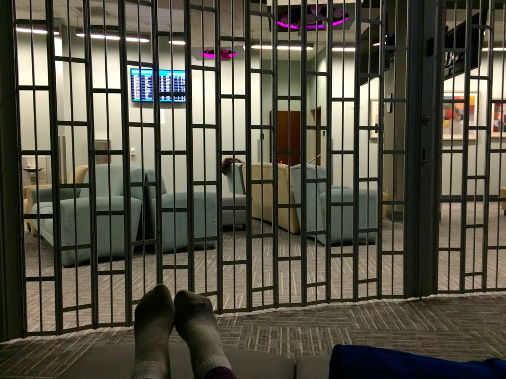 Sleep comes between pages for part of the flight, and I want to fight it, but this ensures I will be well rested for the next one and get more reading done. We land at 12:20 Central time, and have enough time to walk to the next concourse – from C to B – and glance at the Vosges Haut-Chocolat display. I call our auto insurance company to update them on our situation. We board at 1pm when they call out military, etc. and this plane is tiny – only three seats and an aisle wide. I get a window seat, watch us take off, open the bag of sweet/salty crunch mix from the USO and then read for an hour until we both fall asleep.