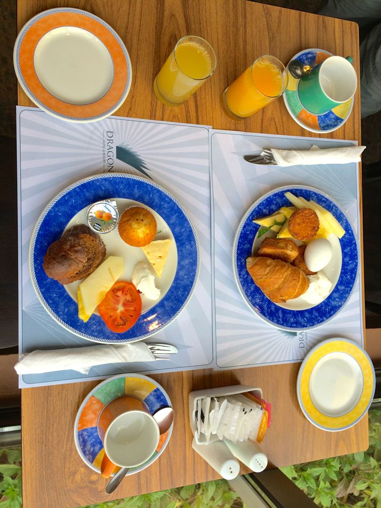 I got rye toast with orange marmalade, a muffin, triangle of brie, a scoop of labnah (sour cream yogurt), slice of tomato, piece of pineapple and honeydew, pineapple juice, and a pancake that resembled a crêpe. The server sees us watching the cleaning crew mopping and squeegee-ing outside and notes that clean up is very much necessary especially after the weekend parties and says something about the humidity. The sun is hiding behind the clouds for now and it feels nice out. We feel guilty heading back to our room and leaving dirty footprints across their freshly mopped floor.