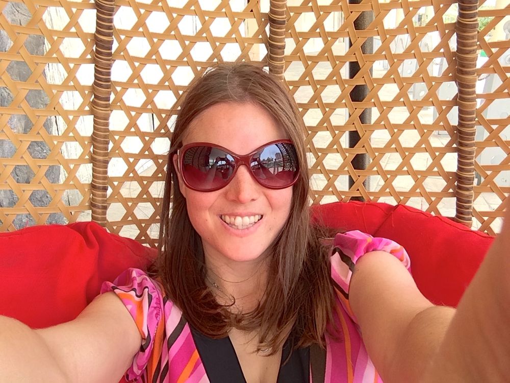 I make a video of Caroline’s visit to the beaches and post it to YouTube and then it’s time for breakfast. We walk over to Yamin Jana and the server asks for our room number – umm, 9 something, 3 something, and a 5. Then we look on the paper by last name and are welcomed into the dining area. The buffet takes up three walls – toast, yogurt, fruit, veggies, cheese, cereal, juice, coffee, beans, mushrooms, boiled eggs… and as we look we are offered a pancake, waffle, or omelette. We choose pancake, load our plates, and take a seat by the window.