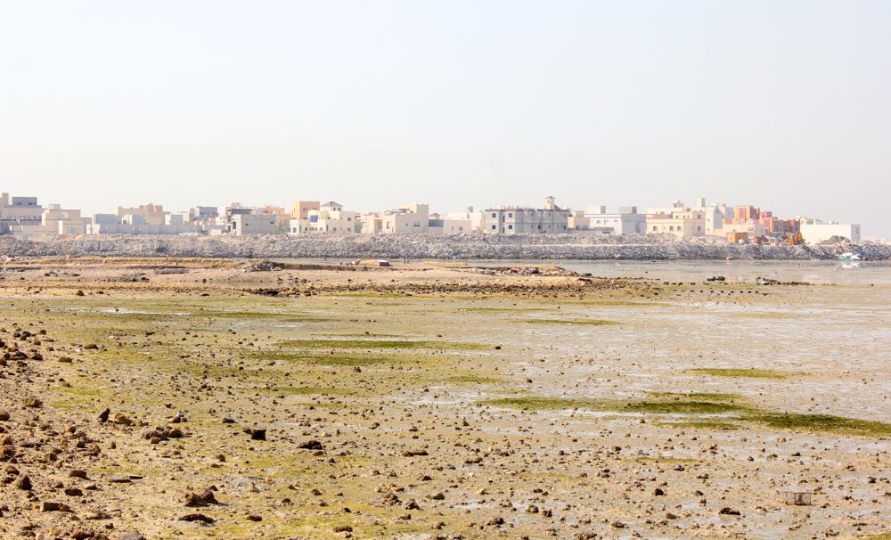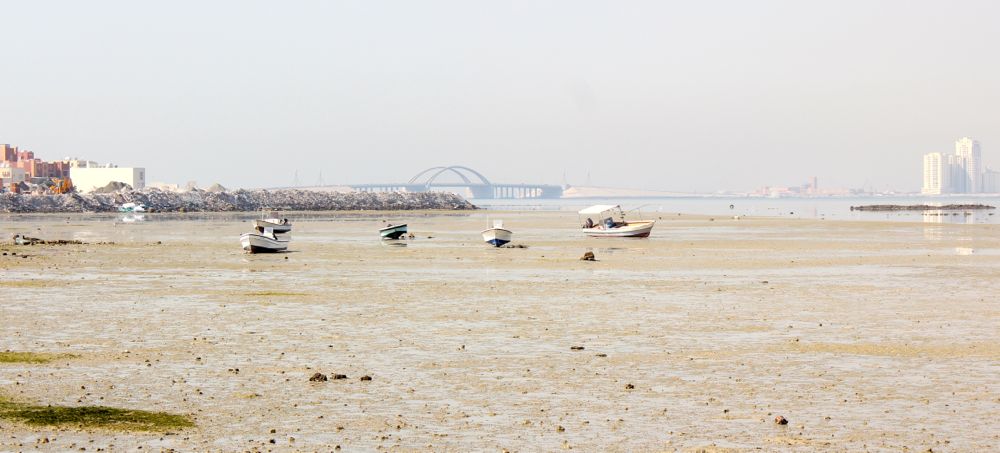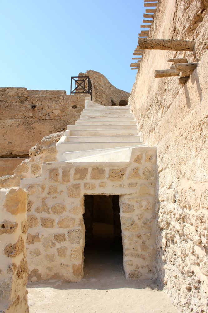 I play ball with Sparky while waiting for the other two to wake. Then I get to tell Caleb how my morning has gone before he takes Piggy out. Sparky will sit by the door and await their return. Then it’s time for us to go to the forts of Muharraq. We arrive at Arad Fort before 8am and notice another car waiting. We walk down the path between the fort wall and the water and Caleb looks up their hours. They don’t open until 9am. We decide to try the other fort – Abu Mahir – located at the tip of Muharraq. It takes us six minutes to drive there, detour included, to see an active coast guard base with a metal door at the entrance.