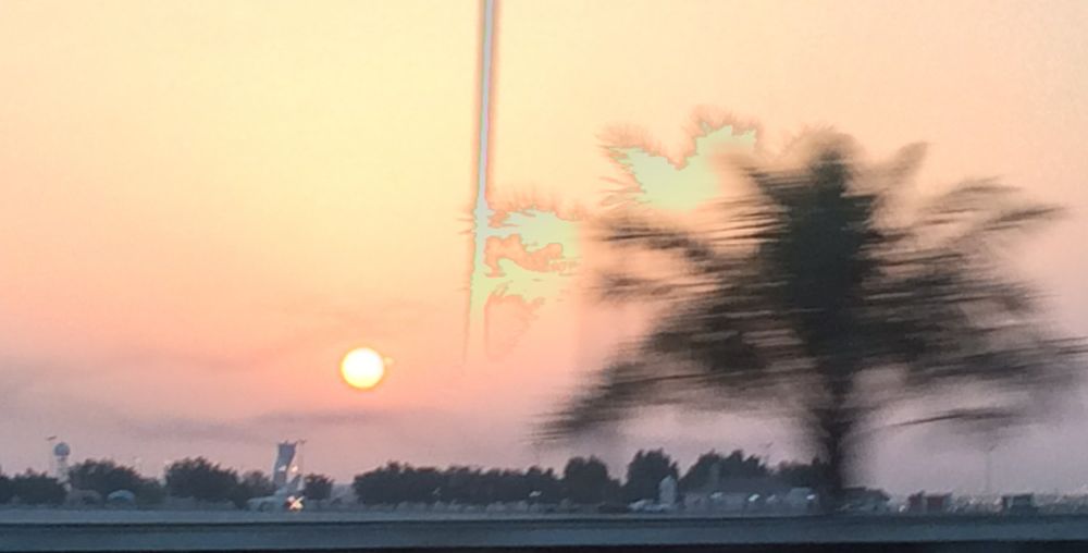 Caleb texts me at 3:50 that he’s getting off work, but I don’t see him until 4:30 – after waiting in the car in the shade near base and then waiting in the roundabout. We were going to buy dog food, but got invited for surprise pizza with Kim. I thought it was the name of the place, but it’s a menu item at Al Mudeef, a little corner restaurant, near Lulu’s in Hidd. There’s a place that sells juice and sandwiches next door, a grocery store, and men selling fish across the street.