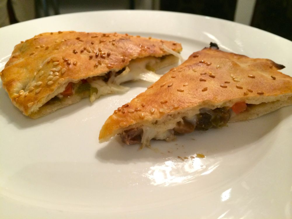 The pizza is more of a pastry, like two calzones together, with sesame seeds on top. It’s pre-cut and I can see cheese, green vegetables, and brown chunks. I figure it’s meat – the surprise is to guess what kind, but my first bite makes me think of mushrooms, so I keep eating. Then I start to taste the meat, and amongst all that dead flesh, I find a delicious tomato piece and all hope is not lost. I will eat more slices chasing the taste of that red vegetable that I don’t find.