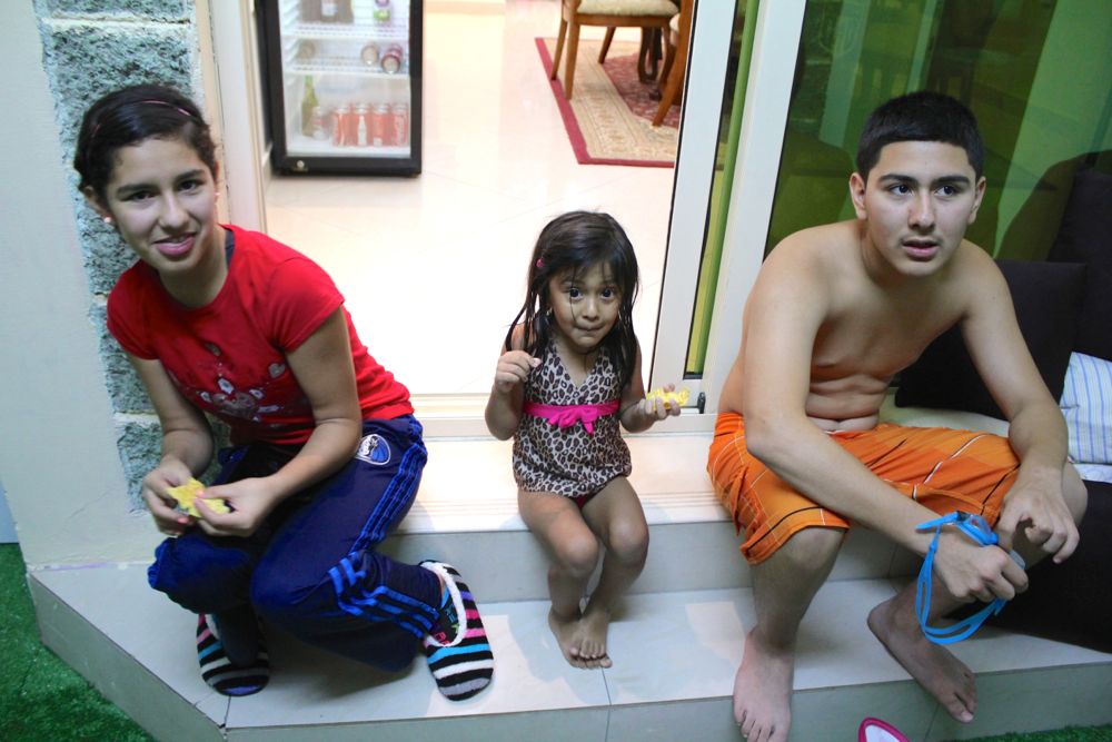 Christie’s kids are smart and respectful. We hang out while the host couple and others go to the bakery to watch the bread bake that will be used for dinner. I went to the third floor and listened to the prayers, got a panorama of the view, and saw the guys on the grill. The kids and some of the guys were in and out of the pool that is cooled in its own outdoor room. Christie’s house is phenomenal. It has three living rooms downstairs and one upstairs for the kids. Back in the kitchen with Angel, “My toe cut itself so I need a banana.” I love the excuse to eat something healthy, not thinking it might ruin her appetite for later.