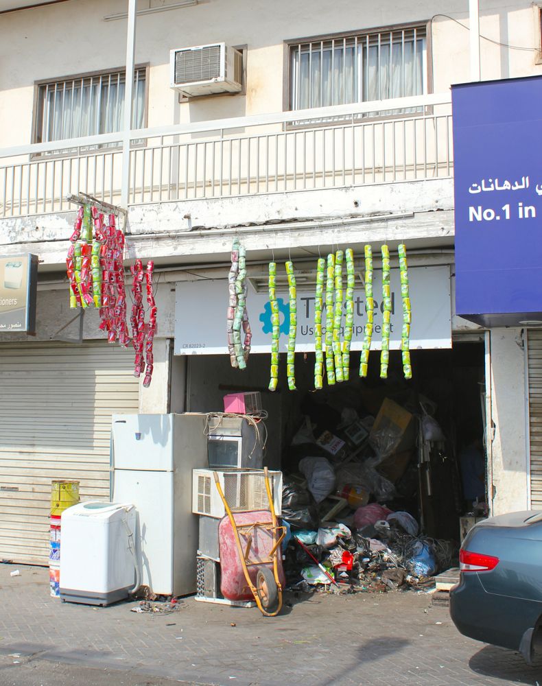 We drove towards the World Trade Center with the intention of walking around, but passed the souq and I kept driving. We were going down a road and to my left I spotted a market, so I turned left to find parking and stopped the car in front of an empty garage door – a shop that is closed for the holiday. There is a cemetery behind us and I take a picture as I see the mosque and wonder if the grounds are considered too sacred for photography. We walk towards the way we came in, past a guy that looks 78 years old sitting on a bench like he’s been living there, so I can get pictures of the art and graffiti on the walls.