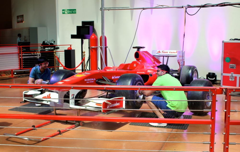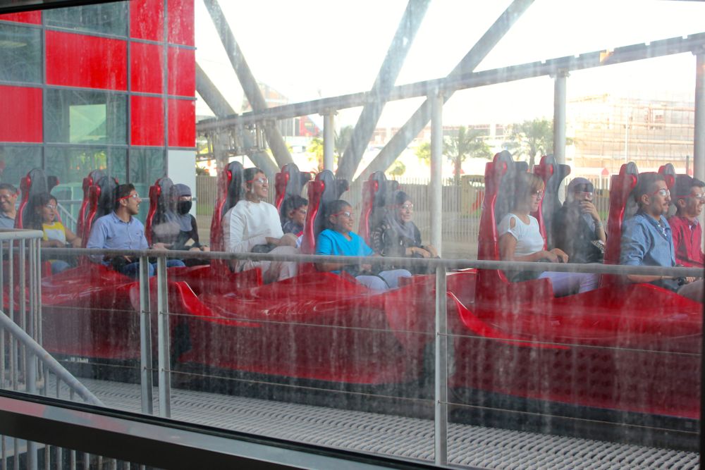 Just entering Ferrari world feels amazing. I get out of the cab, cross the street, and go inside. There are gifts and snacks available before you take the escalator up. I got my bag checked and the guard was kind enough to put my glass bottle inside a pocket so it wouldn’t be seen before I could put it in a locker. You’re allowed 300 ml of water (not in glass) along with diabetic and/or baby food. It was fast and easy to buy my ticket, 240 dirham, with credit card and I was given another ticket, 35 dirham, for my locker – super technology.
