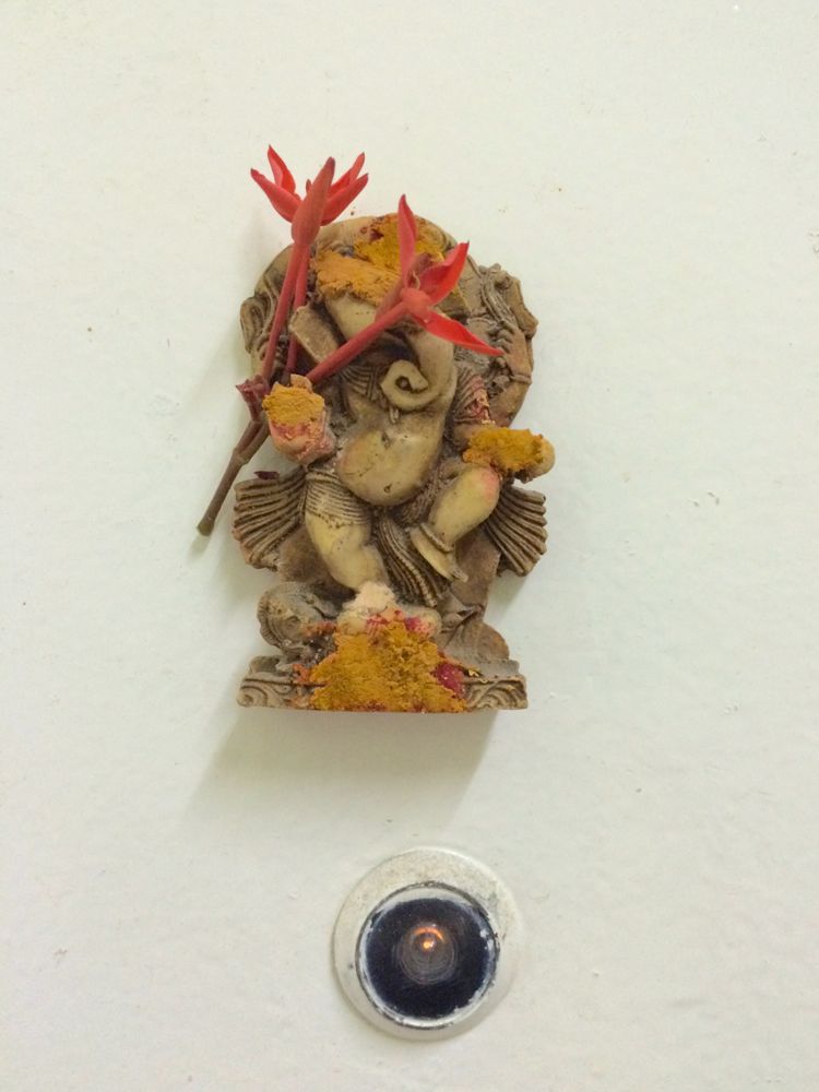 Breakfast was a pudding from the fridge, some cookies from my bag, and a cup of juice. I spent the afternoon catching up on emails and looking into finding a job. I left home at 4:45 on my way to Priya’s to celebrate Ganesh Chahurthi dressed in the Indian tunic she gave me, the henna from Abu Dhabi, and the bindi that she gifted me with as well. We have traditional snacks, lots of chickpeas and jaggery and yumminess, and she exchanges some with her neighbor who came over to admire her pandal (temporary shrine).