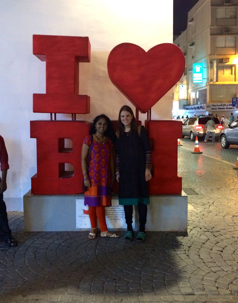 Caleb gets off work at 6pm. I drop Priya off at the gate because she forgot her ID. The guard is impressed with my get-up and compliments me. I pick Caleb up, then Priya, and we are on our way to Bab Al Bahrain (Manama Souq) to visit the temple. We turned right too early and had to go through a security check in the Financial Harbor District. I pointed to the souq, “We want to go there.” He gave Priya directions in their native tongue, but I understood, “right, right, far left, u-turn, right.”