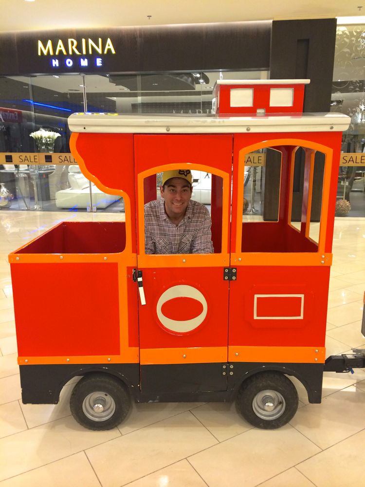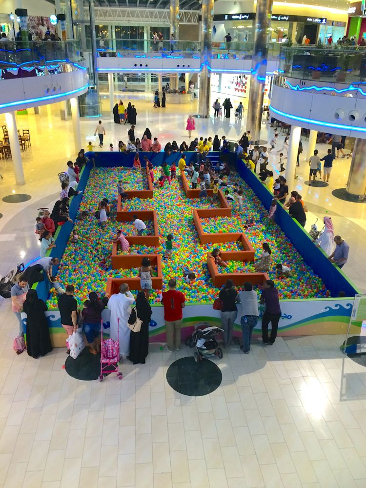 My shoes are hidden underneath a stroller. We pass a shop that sells drinks and go inside to cool off while Priya orders me the cup of tea I saw advertised outside. I thought the hot bubble in the picture was ice. I was mistaken. Caleb offers to take the burning cup of beverage from my hand so that I can handle the bottle of water we buy to share. Time to leave. Caleb was going to get directions to a park so we could walk but we decided on air conditioning instead at Seef Mall.