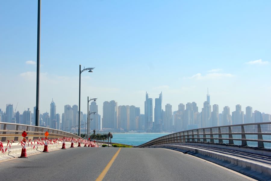 The drive to Atlantis, once off the mainland, is on a road surrounded by off-white buildings and shadowed balconies that all look the same. On the palm, we drive with the Palm Jumeirah Monorail above us and varying flora and architecture beside us until we get to the tunnel that will take us under the ocean and deliver us to the crescent on the other side. We planned to get out here, but near the asymmetrical building were lots of cars and pedestrians and we decided to pass them and go to the west wing where we would have more unobstructed viewing opportunities, even if it they come without an archway.