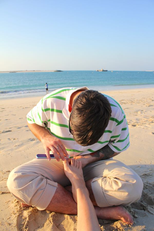 Around 4:00 pm, we went to Jumeirah Beach and found a parking spot in front of the park (that was closed), so we asked the guard how much further till it opened. He told us 3 km, but it didn’t feel that far before we were at the art installation again heading to the free beach between a couple tanning and another one watching their son play in the surf. We sat there for thirty minutes while Caleb did my nails and then we went to look for more coffee for half an hour while walking around the marina. In my search, Siri told me, “Sorry, Jessica, I can’t look for restaurants in the United Arab Emirates.”