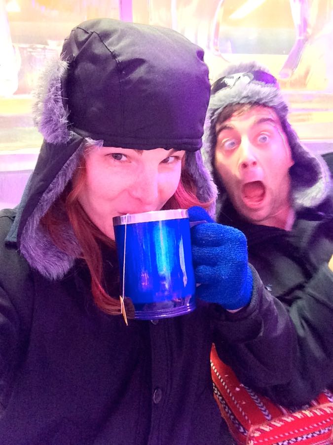 We are given a coat, socks and boots, gloves and a hat, and a bin to put all our stuff in. It’s the world’s largest walk-in freezer with a castle, a racecar, and benches inside covered in traditional pillows. The chairs have blankets that look like the hides of polar bears draped over them. There are sculptures, statues, and things frozen in ice. There are chocolate bars and boxes of juice for sale. I order tea with milk. Our favorite part is the room full of saws hanging from the ceiling with blocks of ice on the floor waiting to be carved.