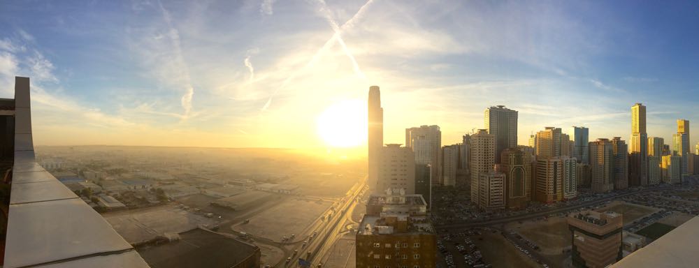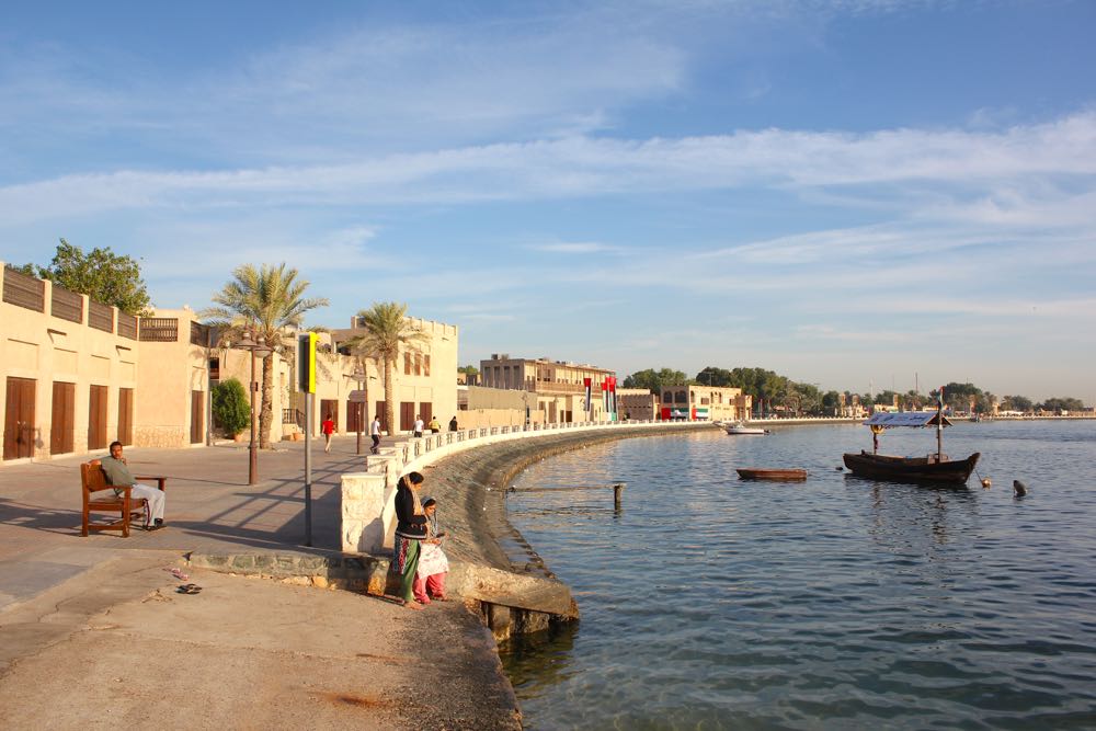 Next was the Heart of Sharjah. Caleb wanted historical looking and museums and this place is full of both. We already want to come back to the UAE. We thought the place might be closed and deserted, but when we saw the bus load of tourists we knew we were in the right place. We had the Heritage Museum to ourselves for five dirham each – full of clothing, pearls, pottery, and a courtyard that leads up to a roof with a view.