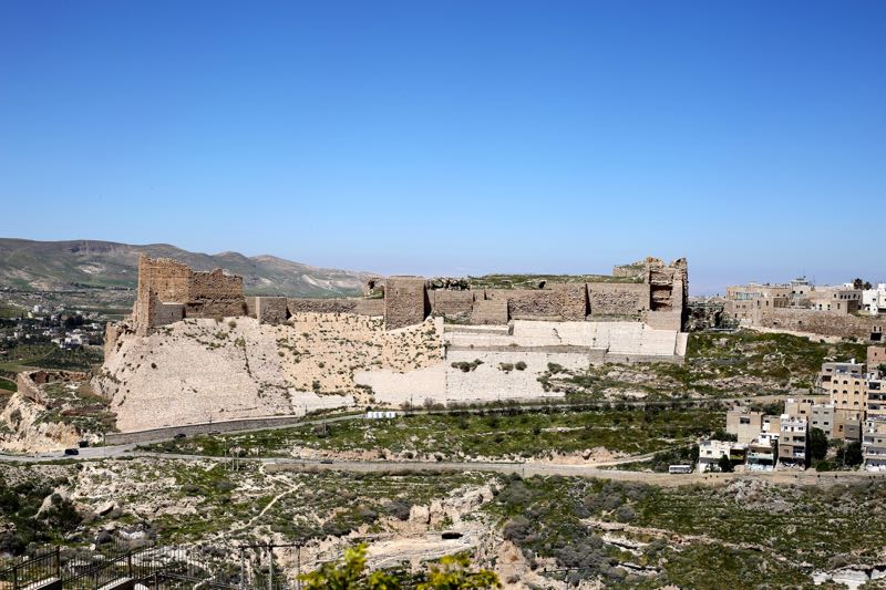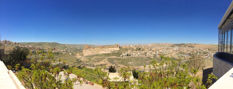 While sitting in the car, I also notice the bruise on my right knee. I was in a rush to leave for the airport and caught myself falling up the stairs with it. I screamed and then froze in pain and though I was dragging it through the airport I’m not letting it slow me down. We stop at the Karak Castle Panorama (Light & Sound) at the upper observation site located 1040 meters up on the southeastern side of the city at noon. There is a restaurant, but we’re not hungry. And there is a guy taking in the view, but he’s not interested in talking with me as I go up some of the stairs for another angle.