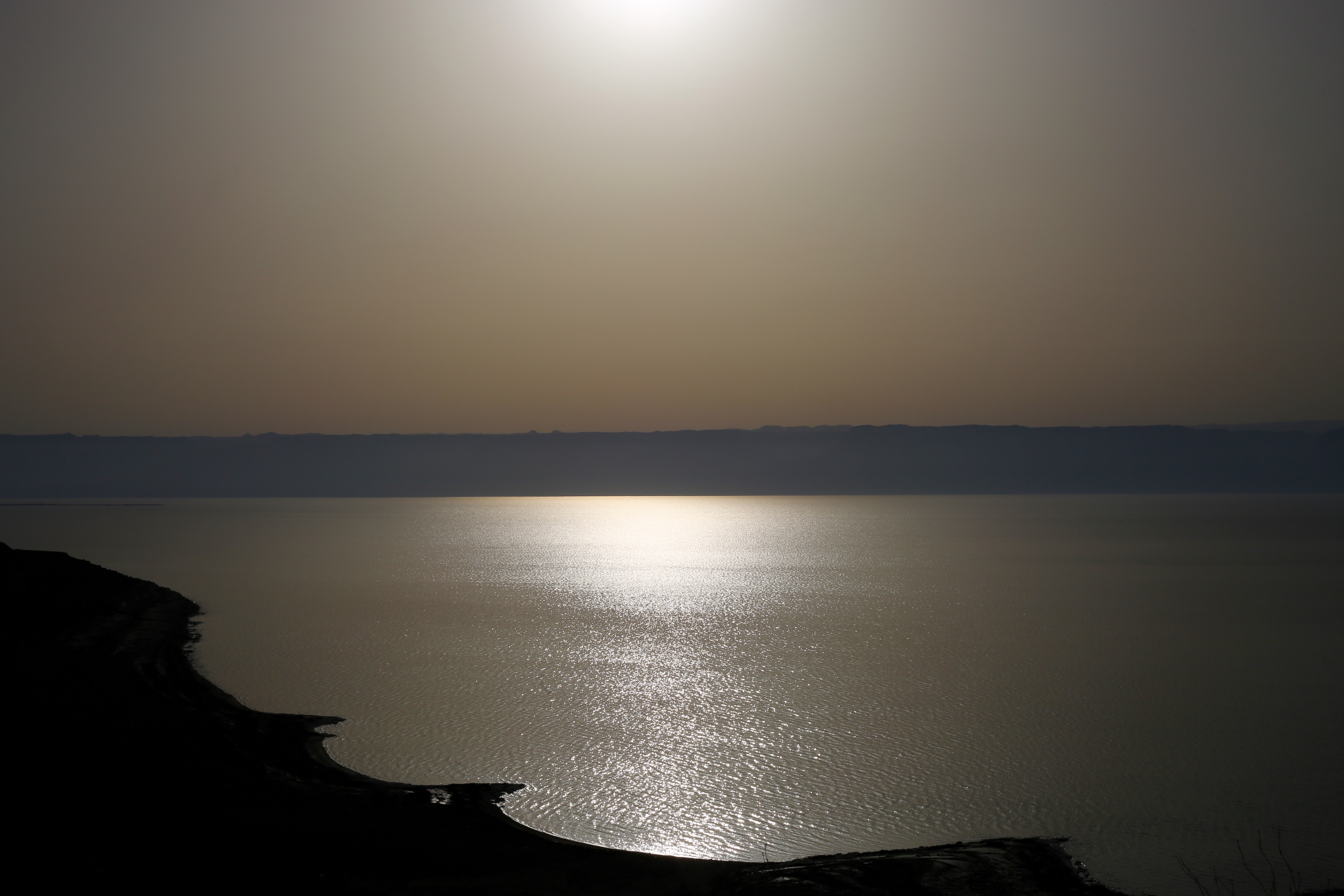 We first saw water on the horizon at 5:13pm and passed a sign for sea level at 5:20pm and thought we were getting closer to the Dead Sea – around the next bend, past the herd of goats, and the goodbye sign from the Municipality of Al Aghwar Al Janubiyya – and there’s just more road going along. I stopped on the shoulder for pictures of the sun on the water in front of us and the rocks behind us.