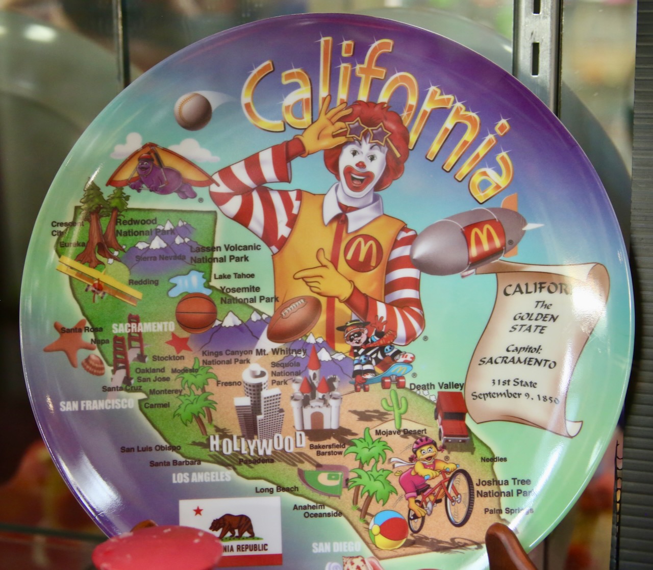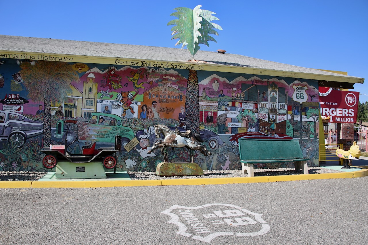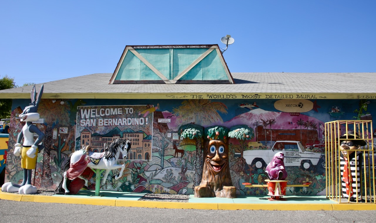 I returned Russ’s books, filled the car with gas, got my teeth cleaned, bought three new undies, got my eyebrows threaded, and bought almonds from Rite Aid (since it’s in the same parking lot). I packed food for the road and put the bedding in the wash. It takes me four hours to get to San Bernardino to the Historic Original McDonald’s Museum, leaving me forty-five minutes to explore the murals outside and the memorabilia inside.