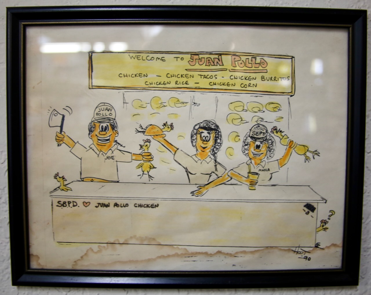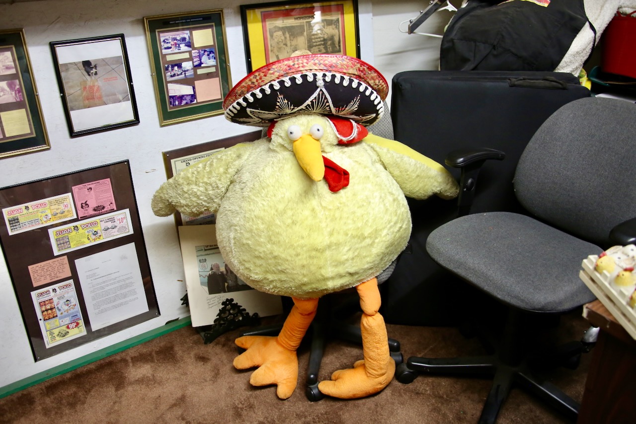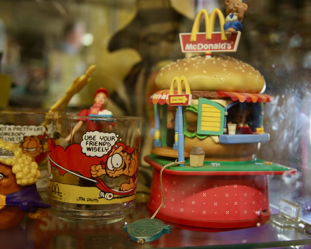 There is a version of Evil Grimace, but not the four-armed milkshake thief introduced in 1971, that was quickly redesigned, from scaly to fluffy with two arms, after scaring children. There are employee pins promoting the Olympics and recycling, as well as international Happy Meal toys from France, the Netherlands, Indonesia, and Thailand. The property was bought in 1998 by the founder of Juan Pollo, after a feud in the 60s and 70s, closed this building, The Big M, and the new McDonald’s just a block away. This explains the giant chicken.