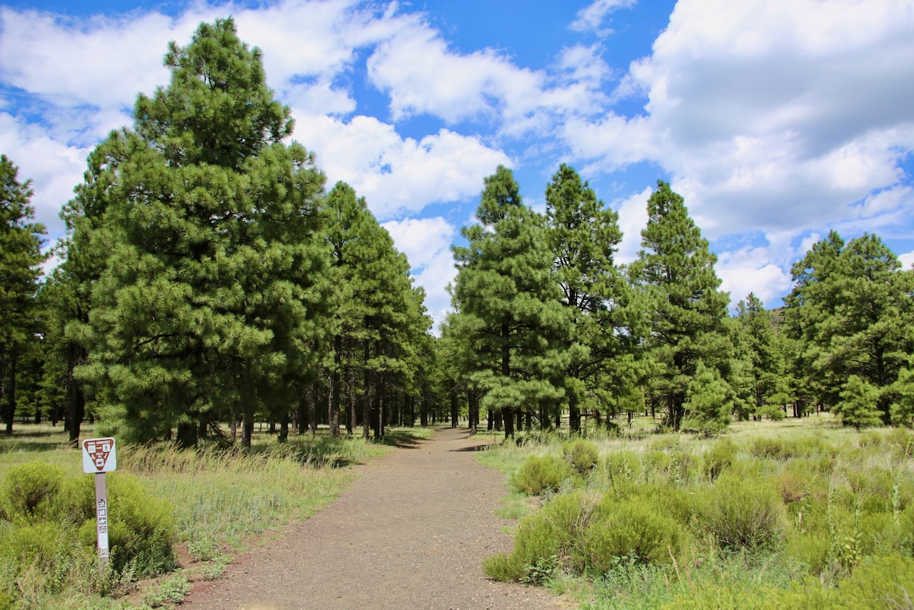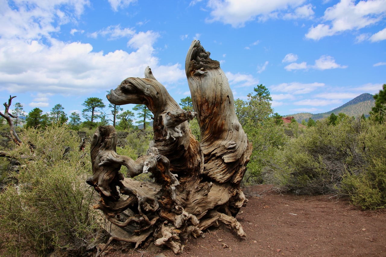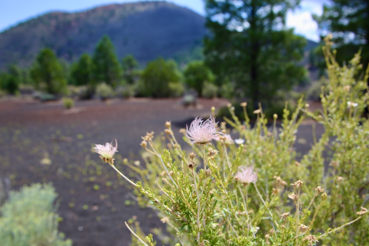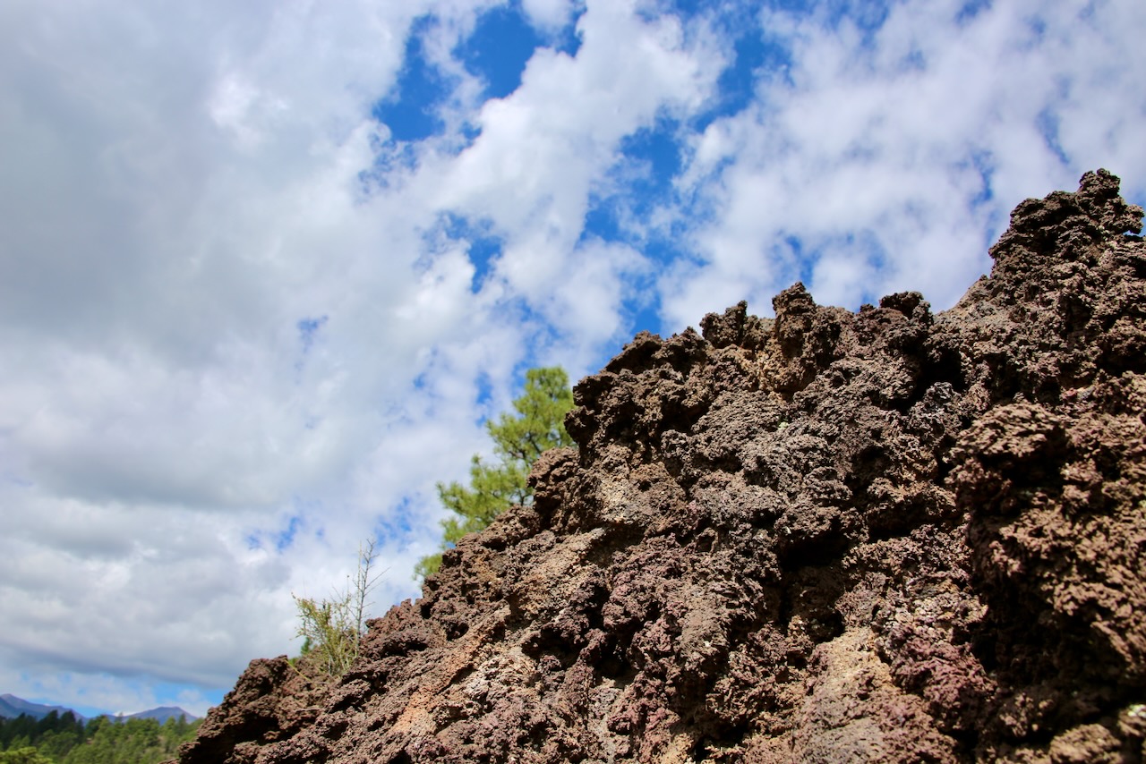 I had already decided I wasn’t staying the night, and missing the turn convinced me it wasn’t worth seeing if I wasn’t going to make the summit, especially having to drive an hour down a dirt road to reach the trailhead. I’ll continue on to Sunset Crater Volcano National Monument. I’ll walk the Lava Flow Trail and two others amongst the trees (paper birch, bristlecone pine, quaking aspen, ponderosa pine), lizards (short-horned, whiptail, western fence), plants (Apache plume, white chenille, rabbitbrush), green lichen, and lava rock.