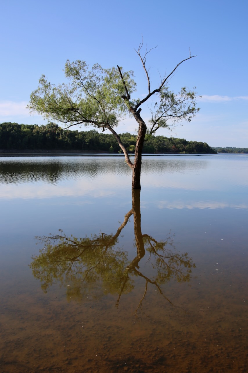 I drove over a hundred miles east and stopped at Lake Eufaula State Park, off the 150-S, and walked to the water’s edge. There, I see a raft of whirligig beetles, the “bumper cars of the beetle world,” just paused on the calm surface since their eyes allow them to see simultaneously above and below the water. If frightened, they will swim in rapid, tight circles or dive beneath the surface. Nearby is the short Crazy Snake Trail that I only accomplished part of before running out. I was walking amongst nature, while some flies were practicing for Nascar around my spider web-covered body, when I got bitten by one mosquito. That’s all it took for me to want to appreciate this environment from a distance.