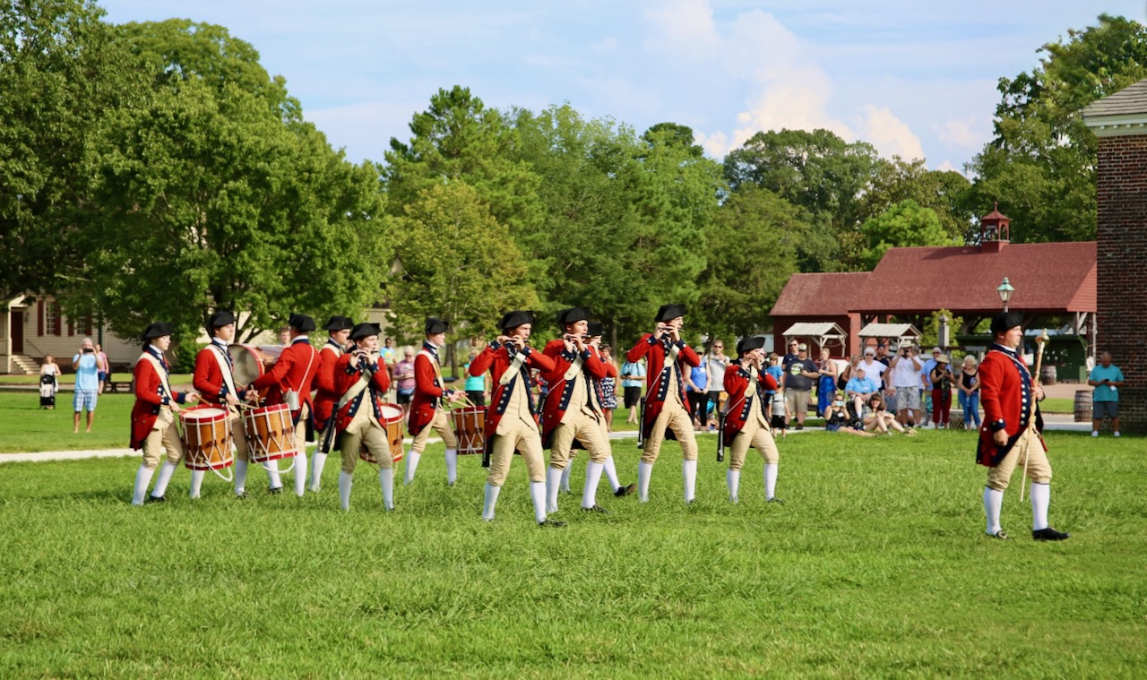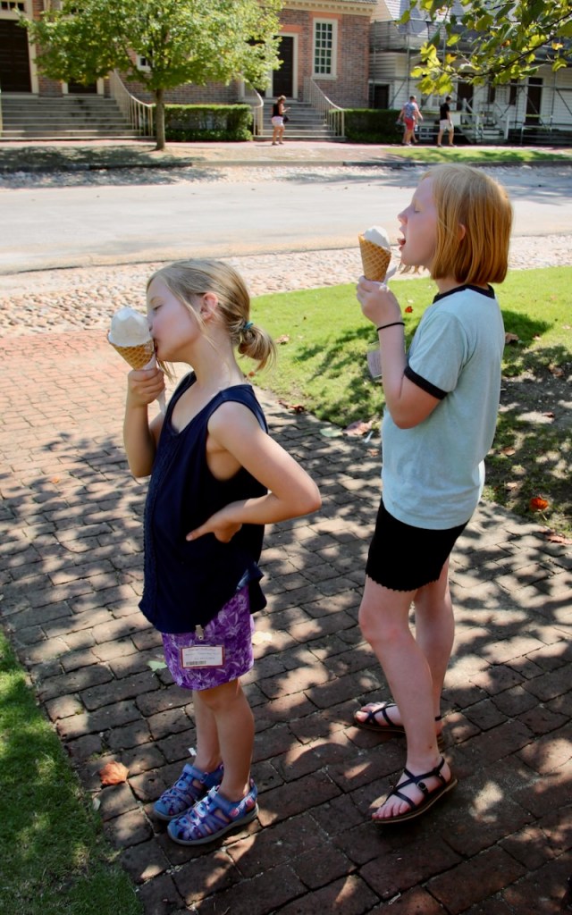We spend the day learning about the kitchen, larder, wine cellar, woodworking, bookbindery, mercantile, and apothecary of the 18th-century. We walk through a house, and a toy store, and we find modern ice cream, too. We stop for lunch at Chowning’s Tavern, tour the courthouse, watch the blacksmith, and hang out in the grass while getting to see the Fifes and Drums Marching into Evening. We get back to Kris’s house twelve hours later. The big kids pillow fight while Jordan cuddles with Uncle Caleb. I show him my photos from the road trip here while we wait on laundry to finish.