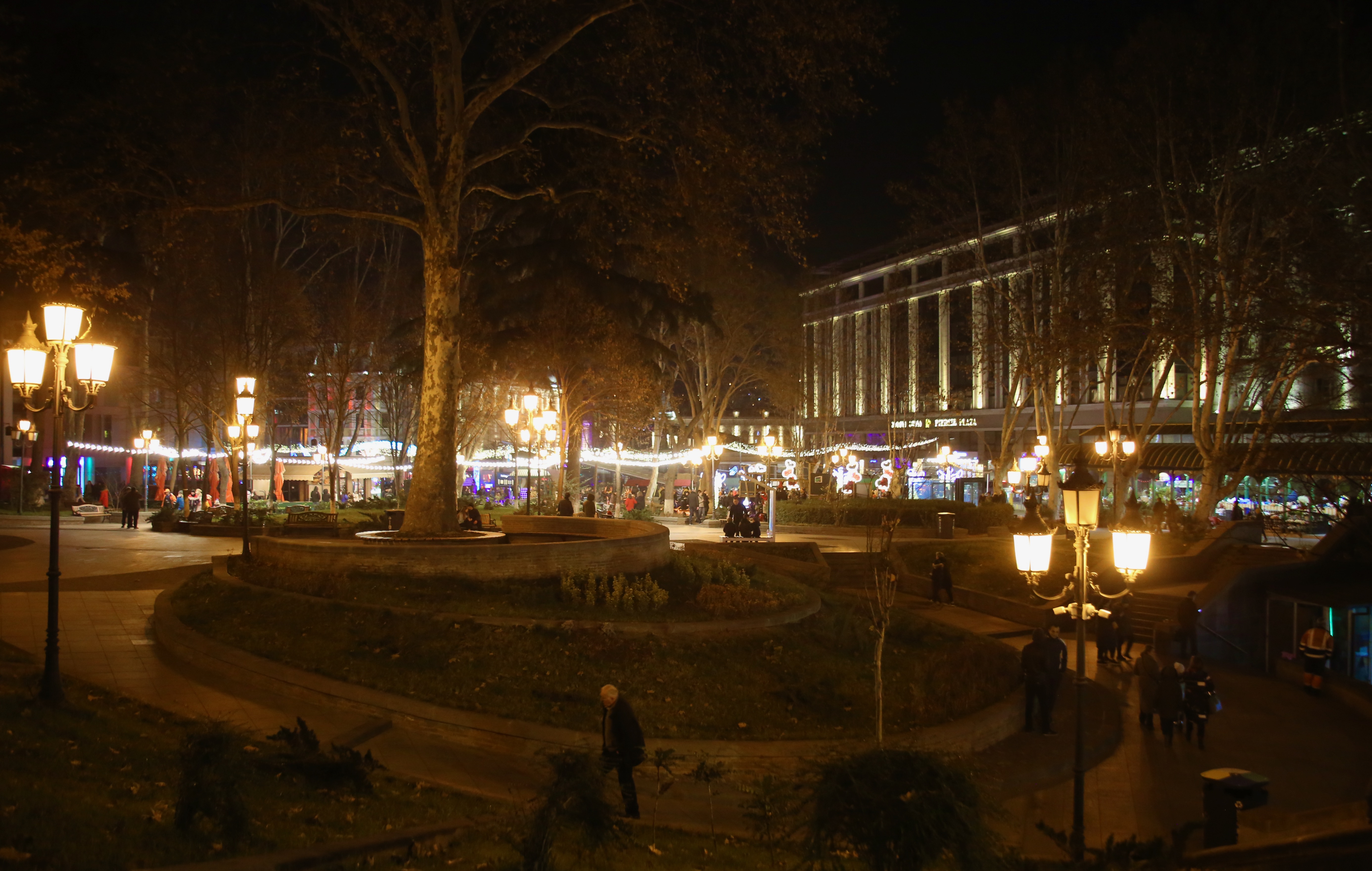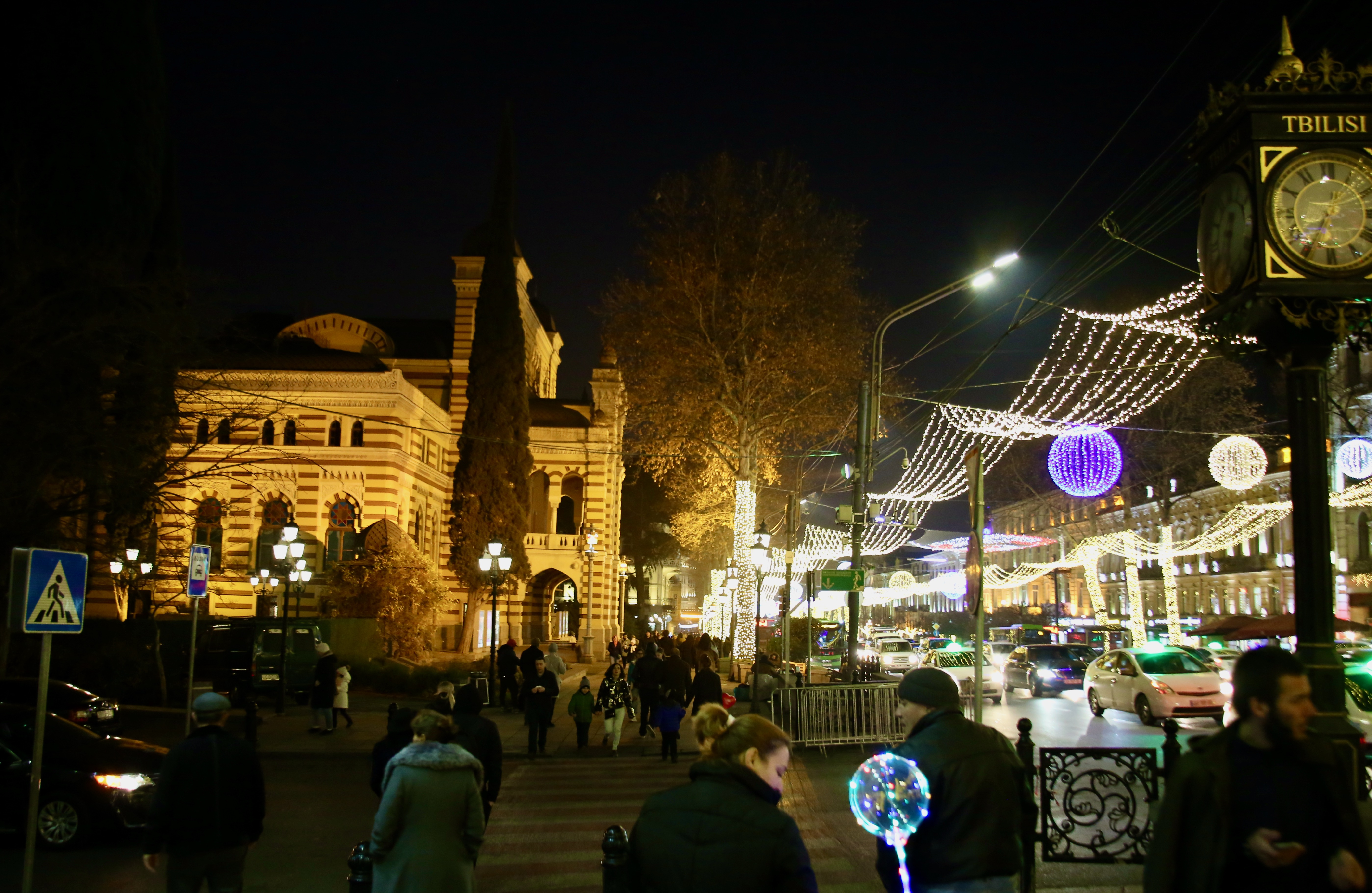 The fob has a key that comes out with an unlock button for the doors and a separate one for the trunk which doesn’t seem to open on its own. I walk down to the main street after putting my bag in the room and my coat on as I figured the temperature would drop when the sun did. I turn left on Merab Kostava St and point to a closed khachapuri (cheese in bread) through the bakery window. I walk with a smile on my face as I take in the Christmas lights, cold cigarette smoke smell, the loose tiles underfoot, the half warm bread in my hands, and the holiday music that I can understand.
