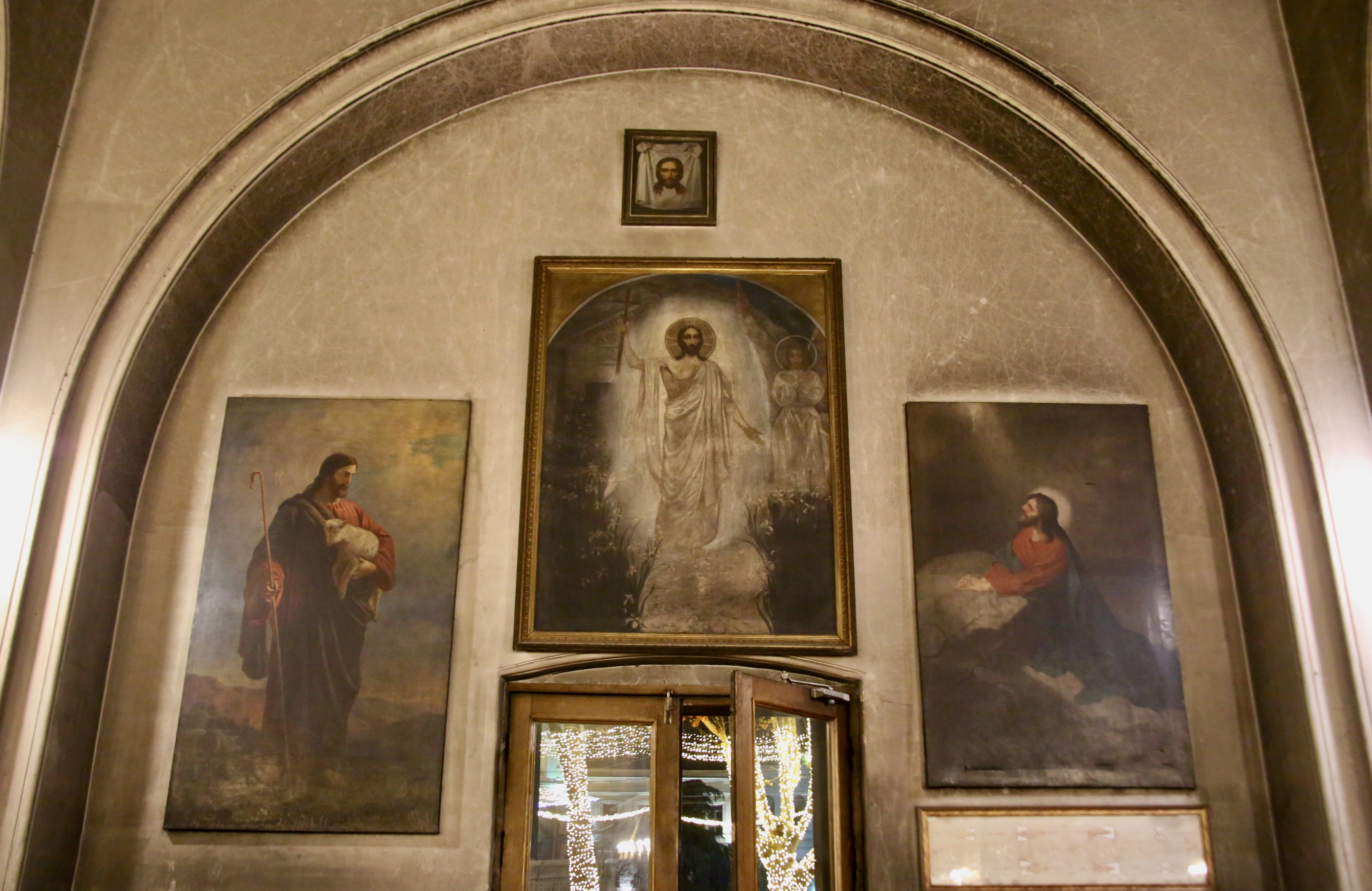 I can’t tell in what order, but people are praying and kissing the cases containing images and taking their blessings from the objects in the room within reach. Some images have more gold and others are bejeweled with a description below in Georgian. Some of the wooden frames and furniture are ornately designed. The dress code sign on the side door says no flash photography and no pants for women. I’m on my way out and hold the door for a kid. His dad will give me a grateful smile and a nod.