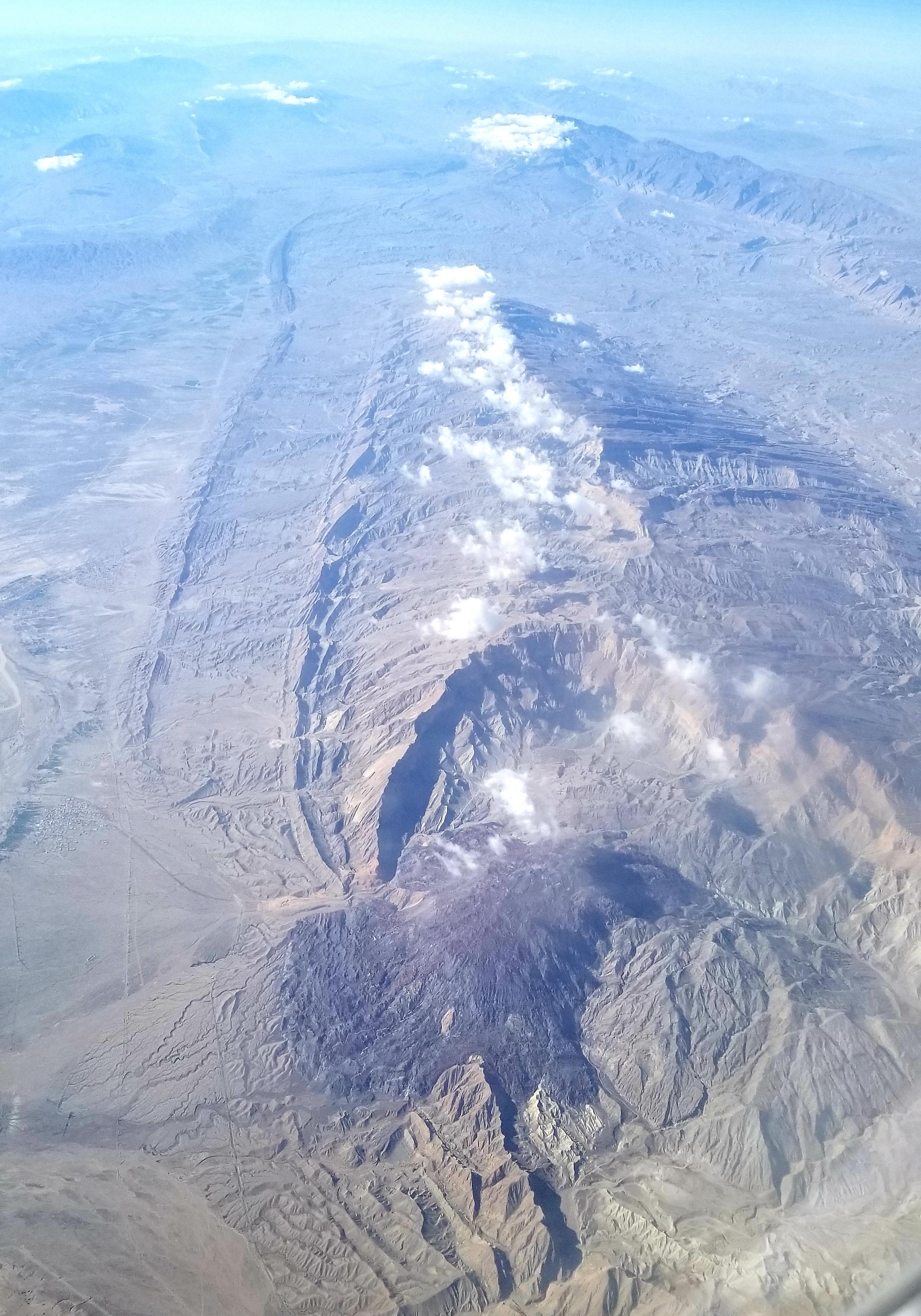 I try a trail mix Evolve plant-based protein bar (which could use only a third of the sugar and taste better) as I fly over the beautiful Zagros Mountain range in Iran. I put my tray table down in anticipation of food but I wasn’t on the pre-purchased meal list so I went to put it back up when I was offered a free veg fried noodle since there were ‘extra’, lucky me. My smart watch says we’re flying at 2,093 meters and though I can still see roads and buildings I know we’re closer to 10,900 meters otherwise we’d be crashing into the 9,800 – 14,922 ft tall snow-covered limestone and dolomite below.