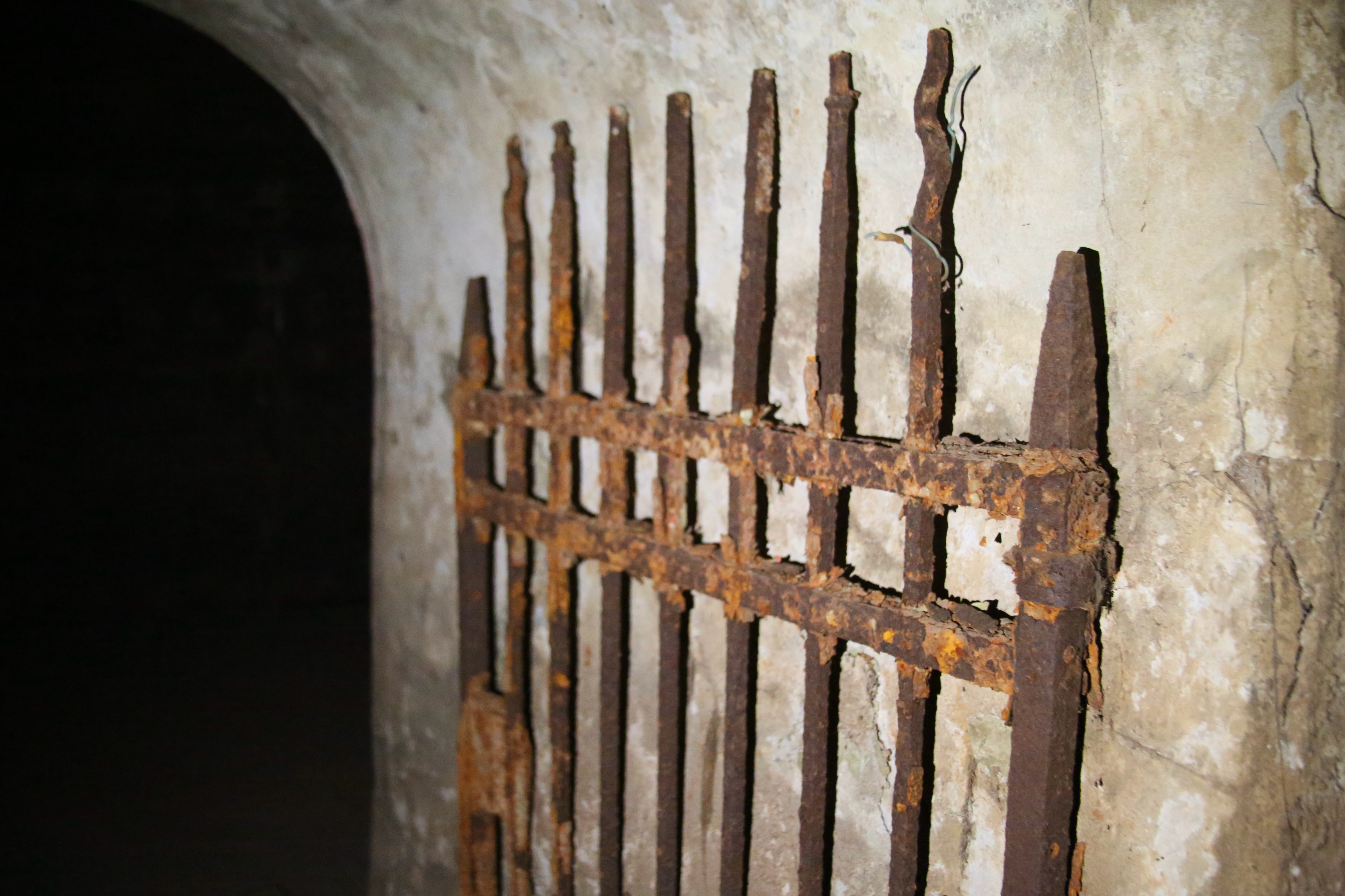 I was told that the skinny (and wet) well is where the parts for the large typographic machine were put down so that they could be reassembled in the hidden basement once they were brought across a tunnel and up a dry well. With the lights on I’m able to make out 1893 on the machine and see the sturdy ladder that survived the explosion of the house and well in 1906 when the police found out and then filled the well with soil. The buildings were restored between 1922 and 1957 when the museum first opened.