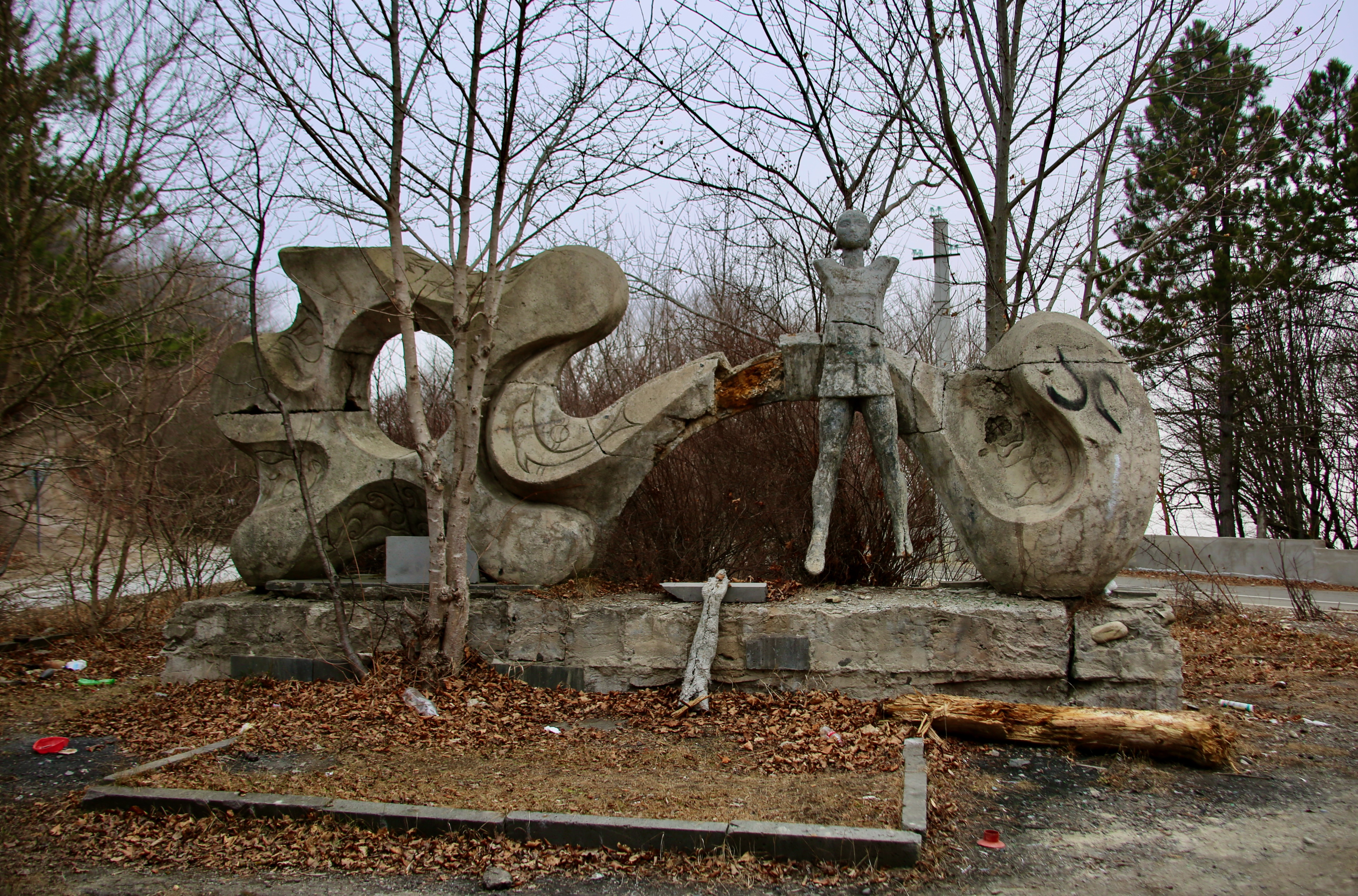 It took me half an hour to get outside the city limits leaving me with roadside ruins, leafless trees, and a few dogs to see for the next 20 minutes before I got to the no cars/no killing sign of the park with another sign letting me know that there’s video control. The road getting here wasn’t bad (as I had heard), a bit bumpy but clearly marked and scenic. As I continued, my path became more beautiful, foggy, eerie, frosty, and forbidding.