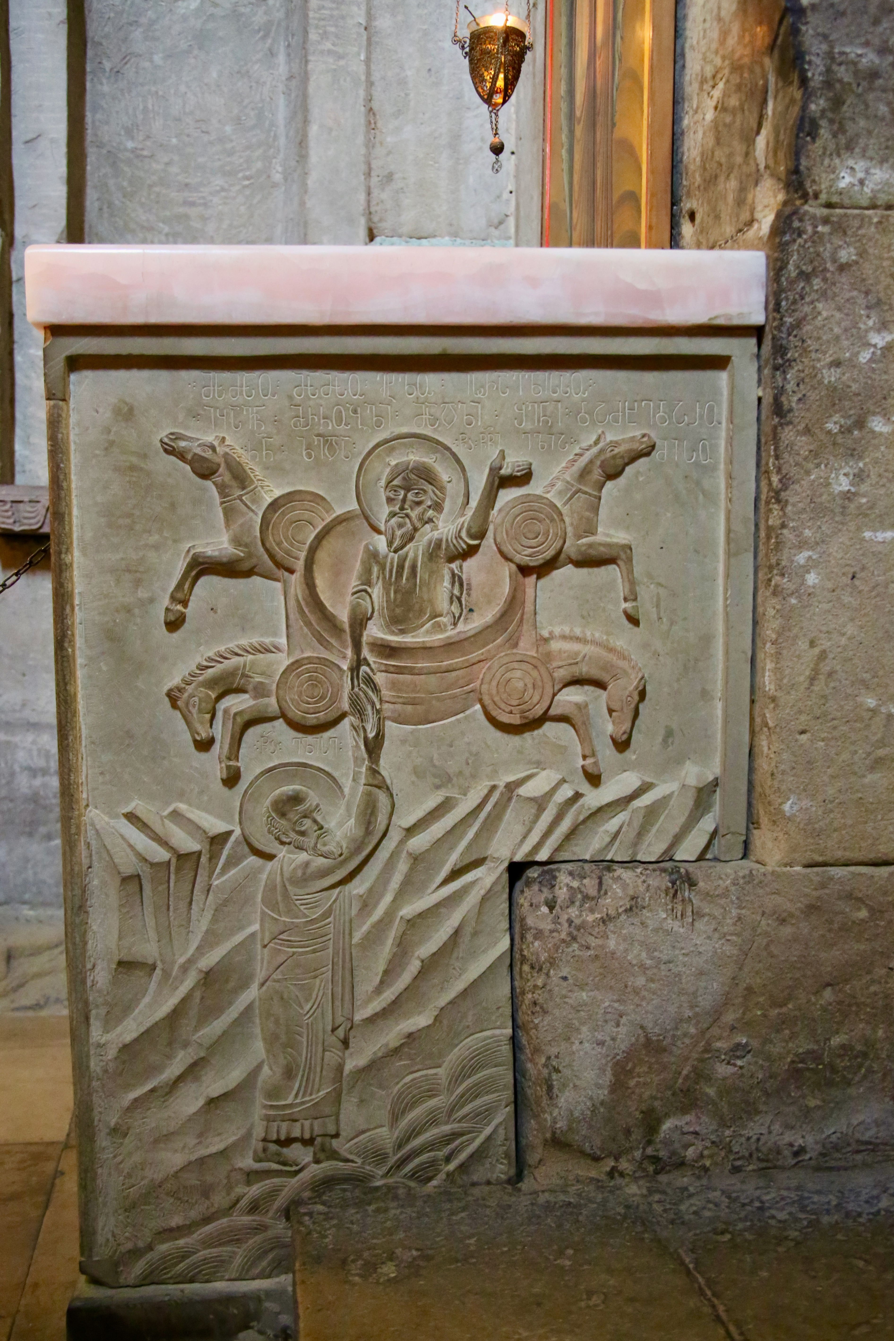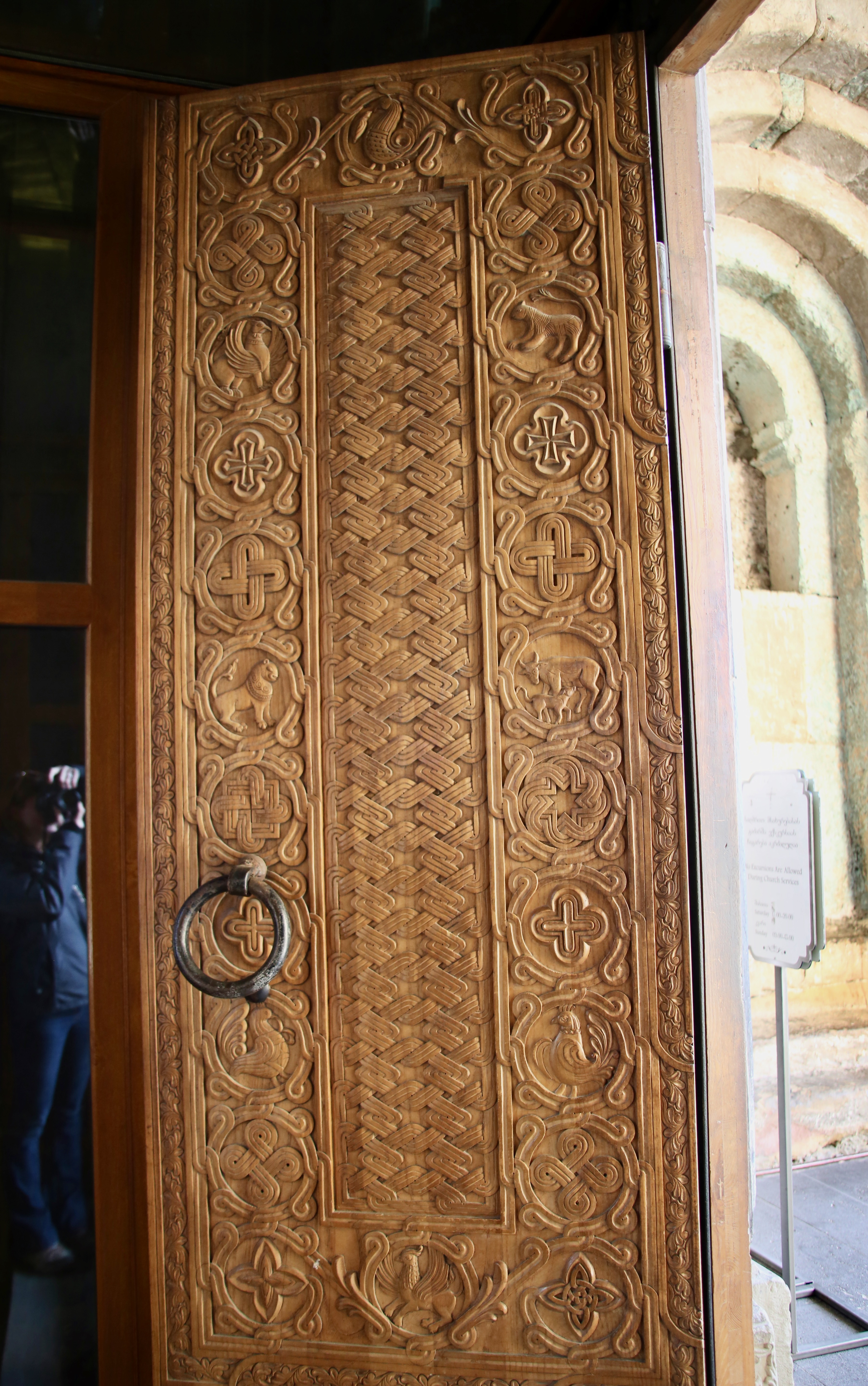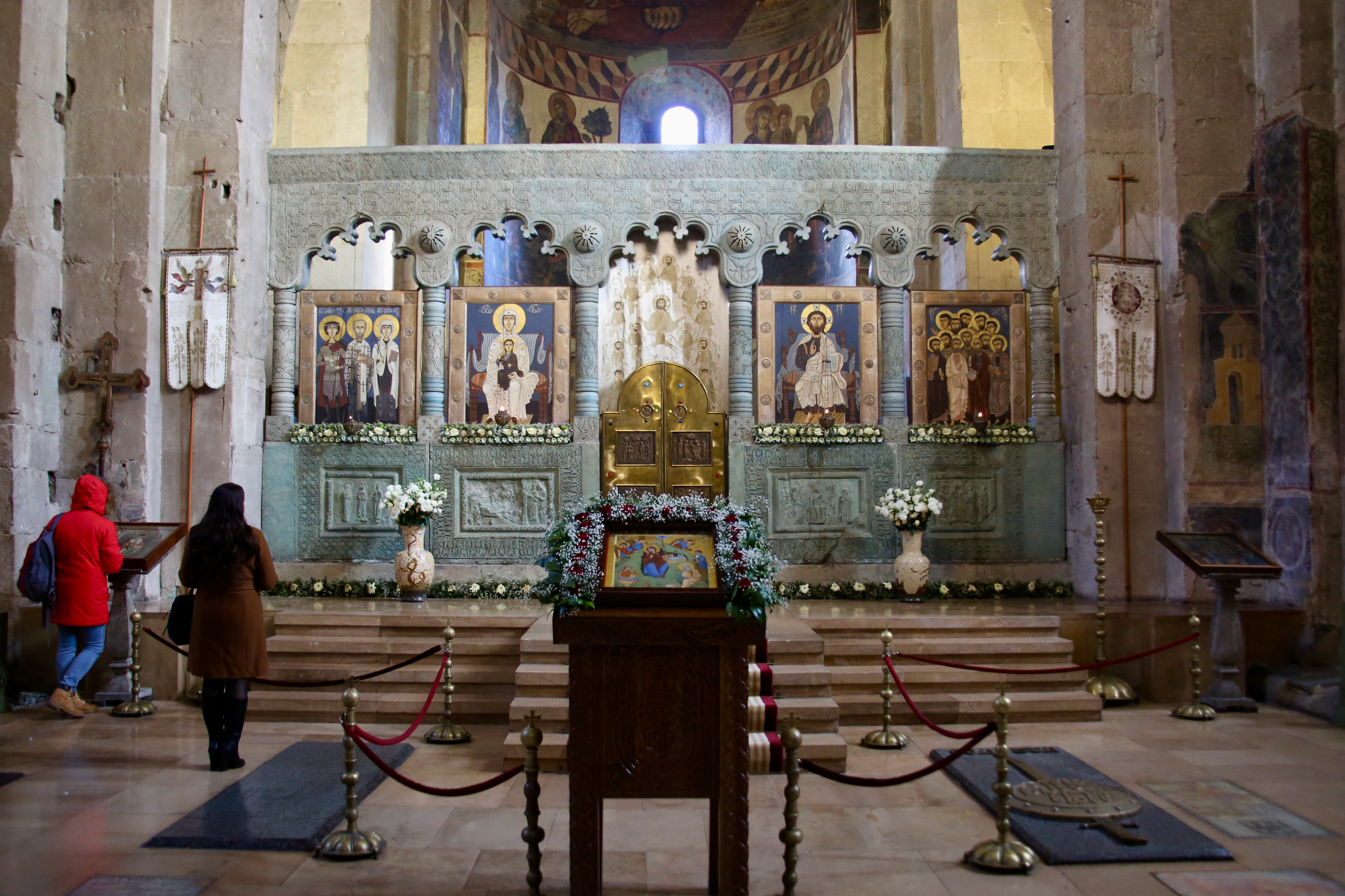 With a satiated stomach and a pocket full of bread, I made my way past the scaffolding on the wall surrounding the Svetitskhoveli Cathedral and take a lap around the outside to appreciate the stone barrier contrasting against the mountains and the clouds with evergreens and wooden benches spaced unevenly on the inside of the wall. Even the aged exterior entrance is drenched in details from the engraved wood and stone to the mural above the door.
