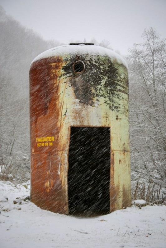 I slow down and stay in the middle of the white path using the fences as markers for their guarding ditches nearby. There’s just a memory of cars ever being here as I pass a man walking away from a dog sitting in the road. Snow starts to cover everything — statues, rocks, houses — and is transforming the landscape. I’m easily drawn in by its magic and am ready to move into one of these abandoned-looking structures, but nervous I’ll have to explain to the owner what I’m doing there.
