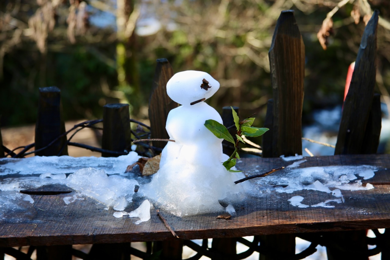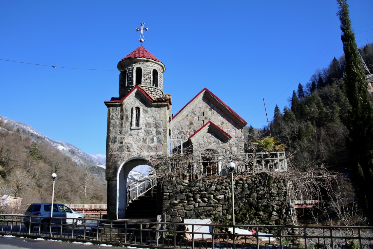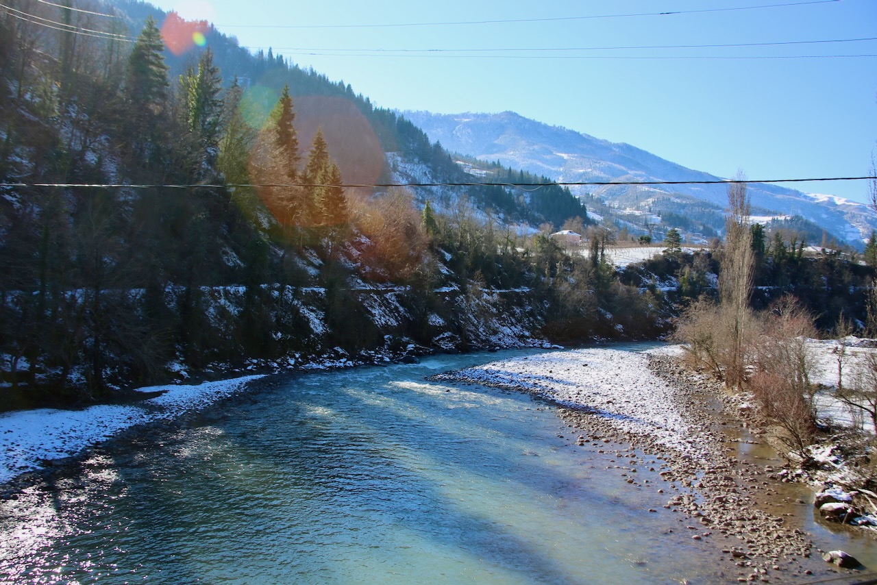 Back at the Dandalo Waterfall, there is a picnic area where the adults are drinking vodka while a boy practices throwing snowballs. The men are busy standing in the street like their cows. I follow the other footsteps in the middle of the bridge and get some pictures of the Acharistskali River. There is virgin snow on the next bridge, so I’m able to continue. Just watching the snow evaporate is so relaxing. The roads are a mix of dry, wet, ice, snow, and slush, whether they’re paved or not.