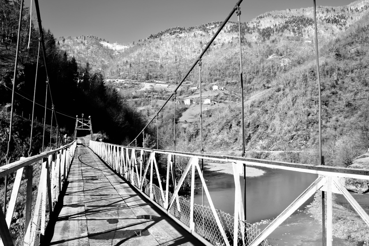 With the lack of traffic, I’m able to take a picture of myself standing on a one-lane bridge before driving across and then stopping again to set foot on the Dandalo bridge, which is curved and slippery, covered in melting snow and smooth rocks. It is a feat of medieval engineering, being dated between the 9th and 10th centuries. It spans about 20 meters (65.5 ft) over the river and is roughly 3.5 meters in width. There are several bridges of similar design still in use today.