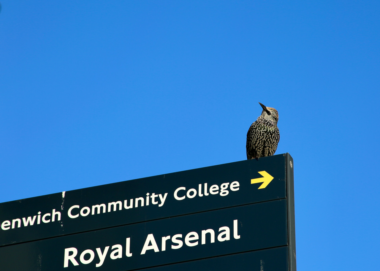 I just realized the times for the trains are departure and not arrival times as I wait for my second train before I can start my walk from Woolwich Arsenal station, a half mile from the southern tunnel gate. The market is setting up to sell shoes, bags, and clothes under the eye of a Common starling.