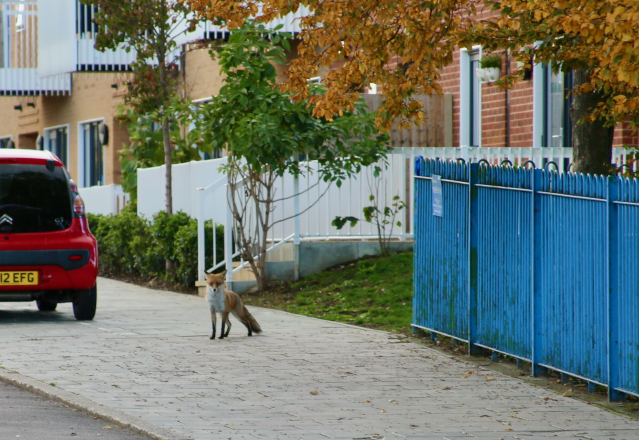I see a fox on a sidewalk before taking a picture of a five-seated horse ride on a playground. There were three boys on their bikes that rode up to ask why I took the photo, but rode off again before I could explain. I’ll take some Cadbury fingers offered from two friends sharing the package of chocolate.