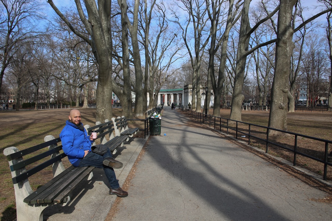 I’m up early, so I’ll join Farid’s roommate, Eliot, in the kitchen for some caffeine and conversation. When Farid wakes up, he makes us breakfast and more coffee. We have no set plans, just to get out and see the city. We stopped for a hot cuppa from Variety Coffee and took a break in the nearby park after exploring for two hours. Father Studzinski Square is nearby to honor a pastor who served this community for over 19 years.