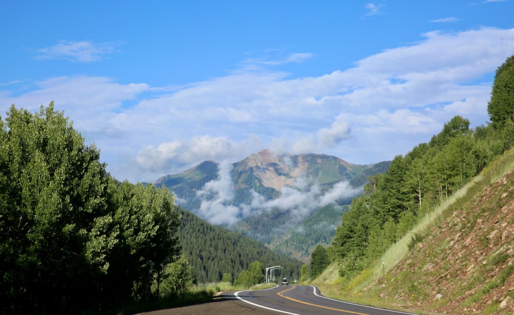 We’ll stop about every 15 minutes on the 145 N for pictures until our eight-mile roundtrip detour into Telluride, to the trailhead of Bridal Veil Falls – 1.2 miles up with almost 1,000 ft elevation gain. The line of cars and people walking from downtown tell us this is a popular hike. We pass two eight-year-olds testing out their golf clubs on the roadside.