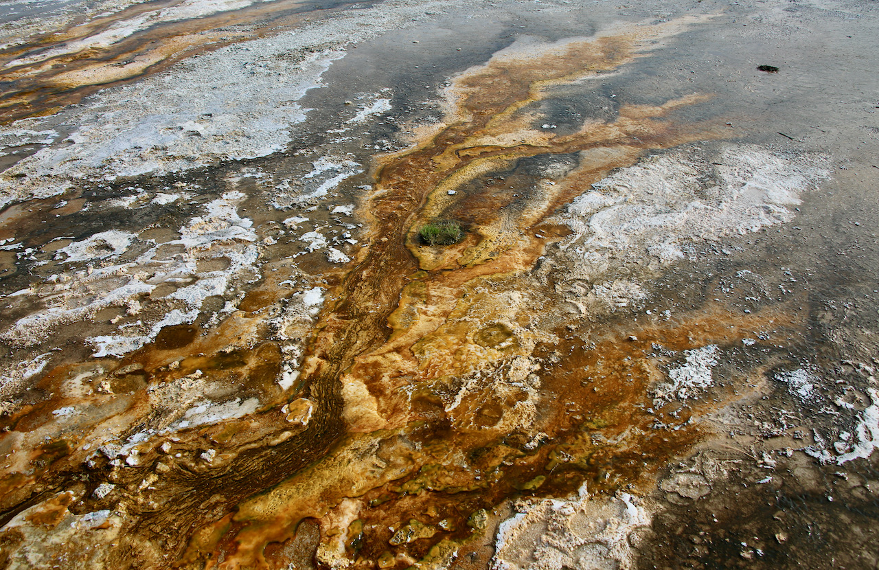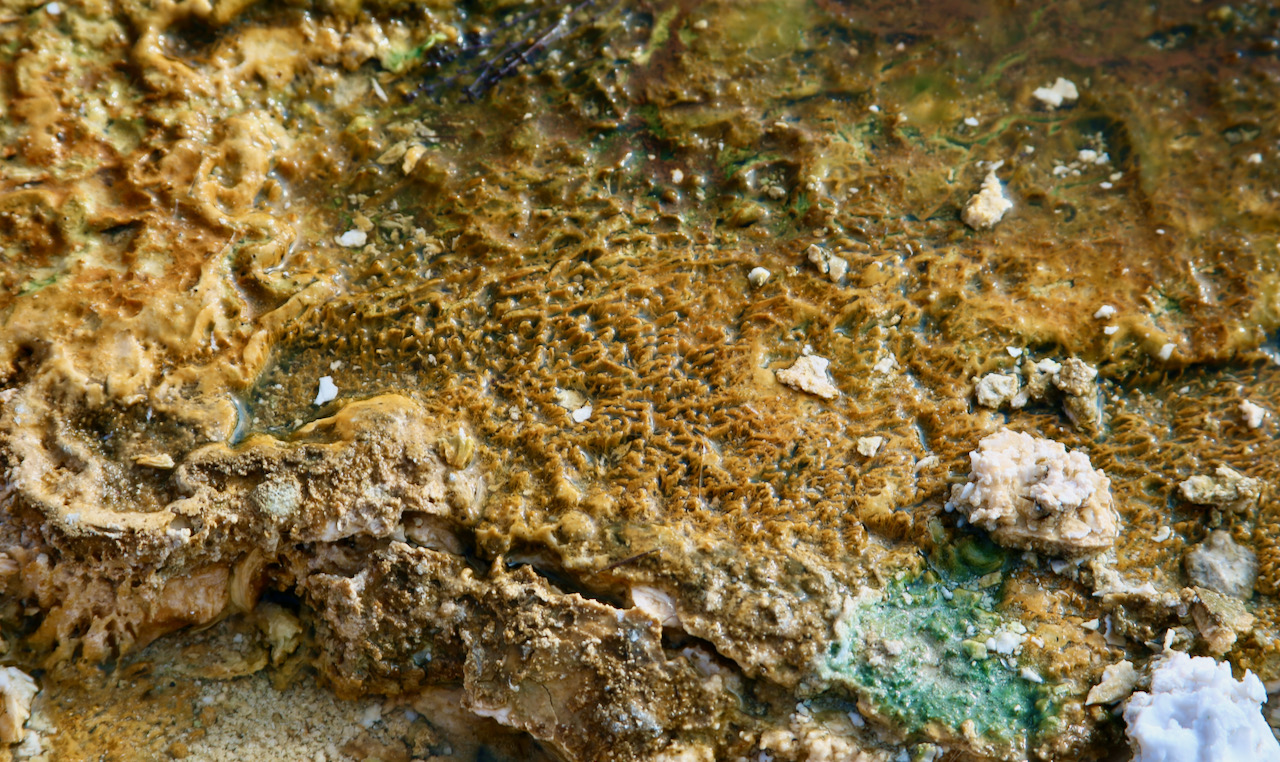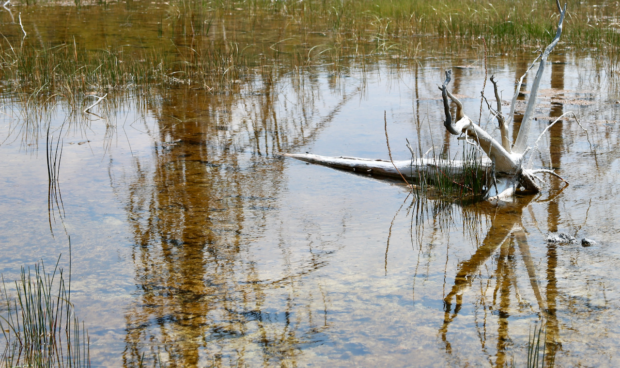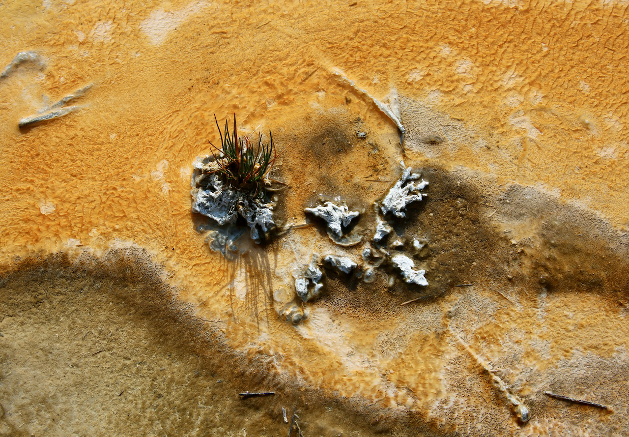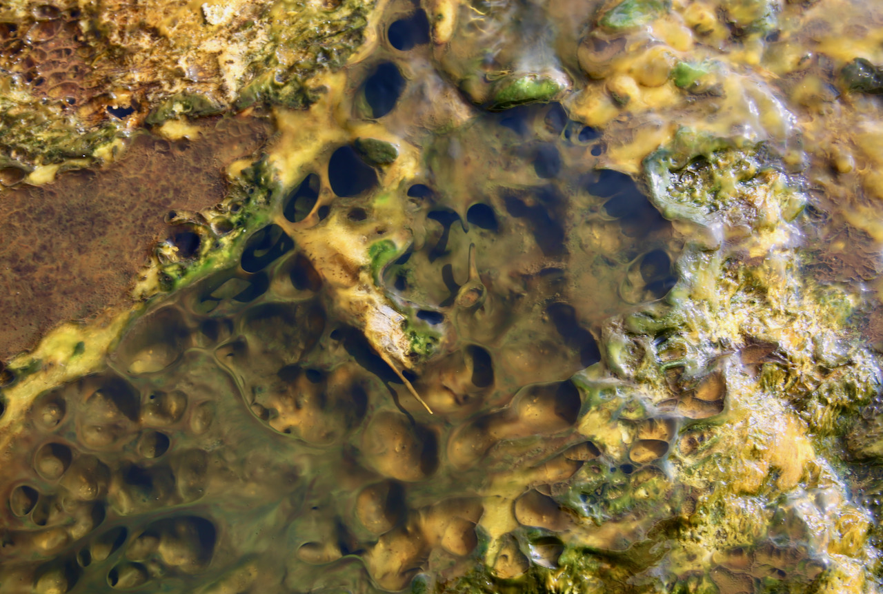 We saunter along the boardwalk, bending down to capture a variant of angles, colors and formations, paths of light, bubbles of hydrogen sulfide (a toxic gas if concentrated), and to follow the flow of water as temperature, seasons, and decades continue to make subtle changes to this taiga biome.