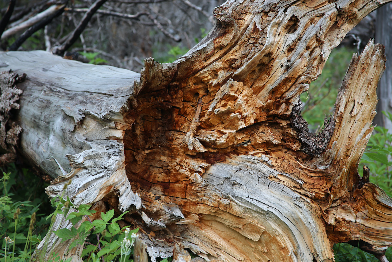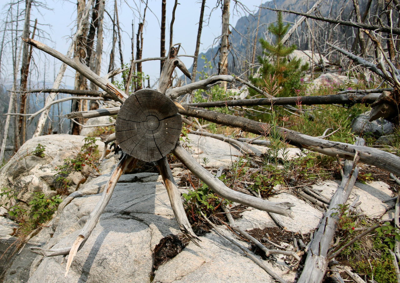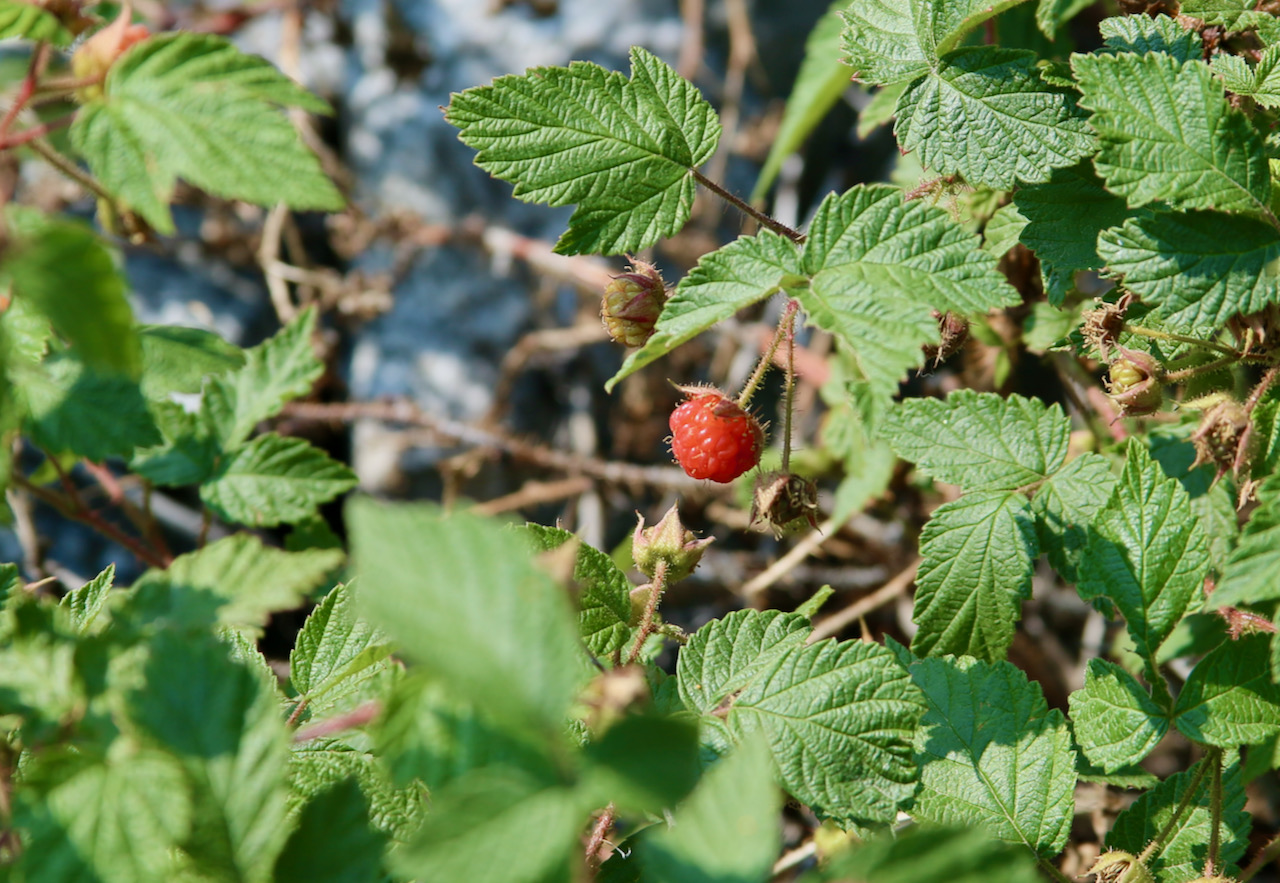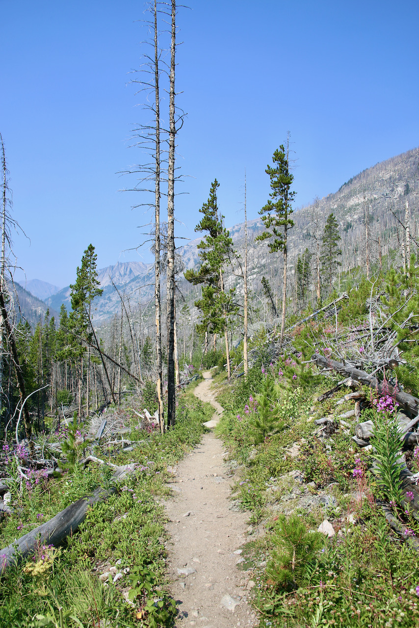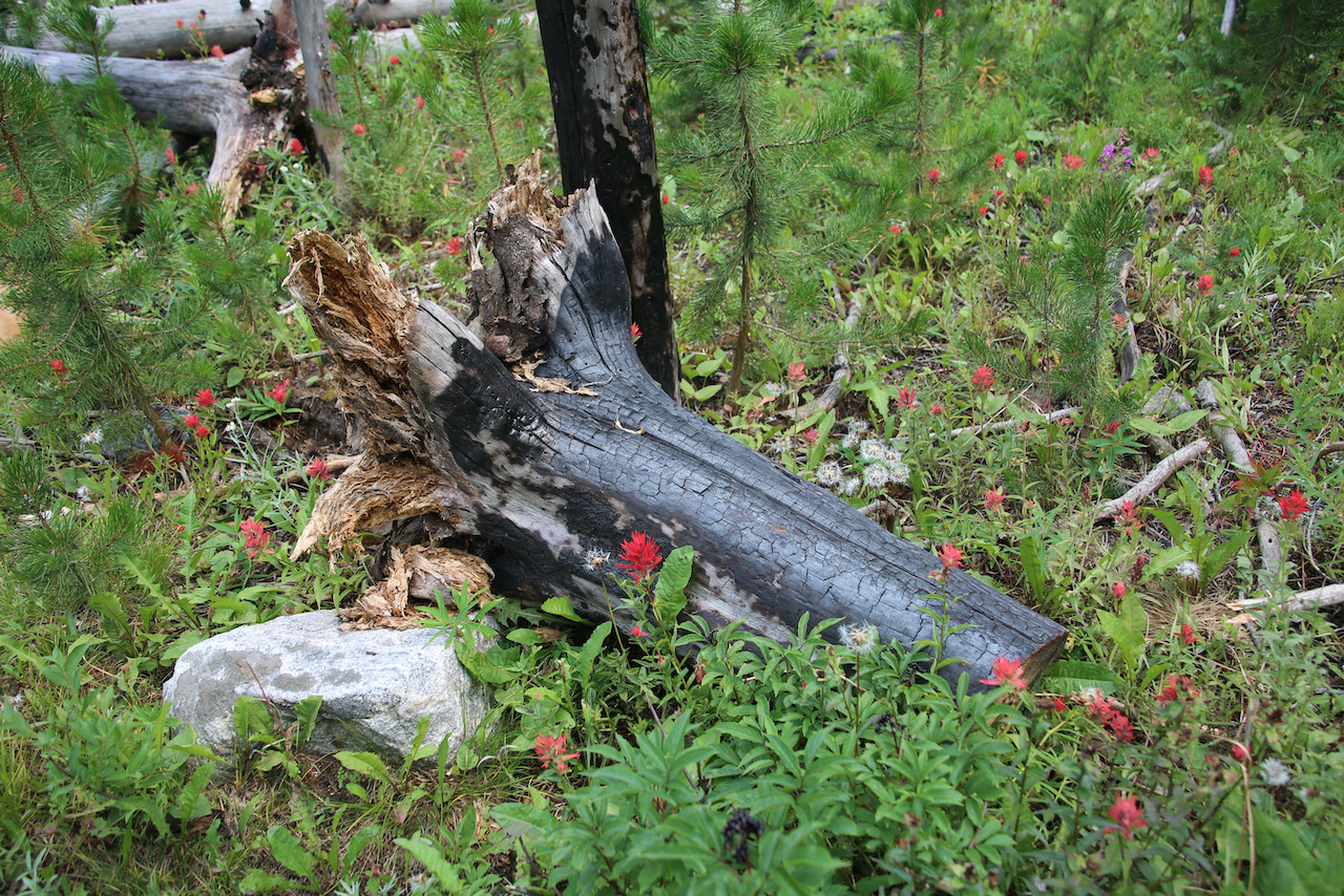 I’m carrying my camera in one hand, we’re taking turns carrying Dad’s extra lens, and have two (should’ve been four) liters of water on my back with no snacks. We get to the seven-mile marker at 230pm and turn around. Going downhill increases our speed but doesn’t keep us from seeing three snakes within 30 minutes in the land of burned trees and tiny raspberries. Two guys will follow us out from a distance for the last mile which we are surprised to see the cars again so quickly.