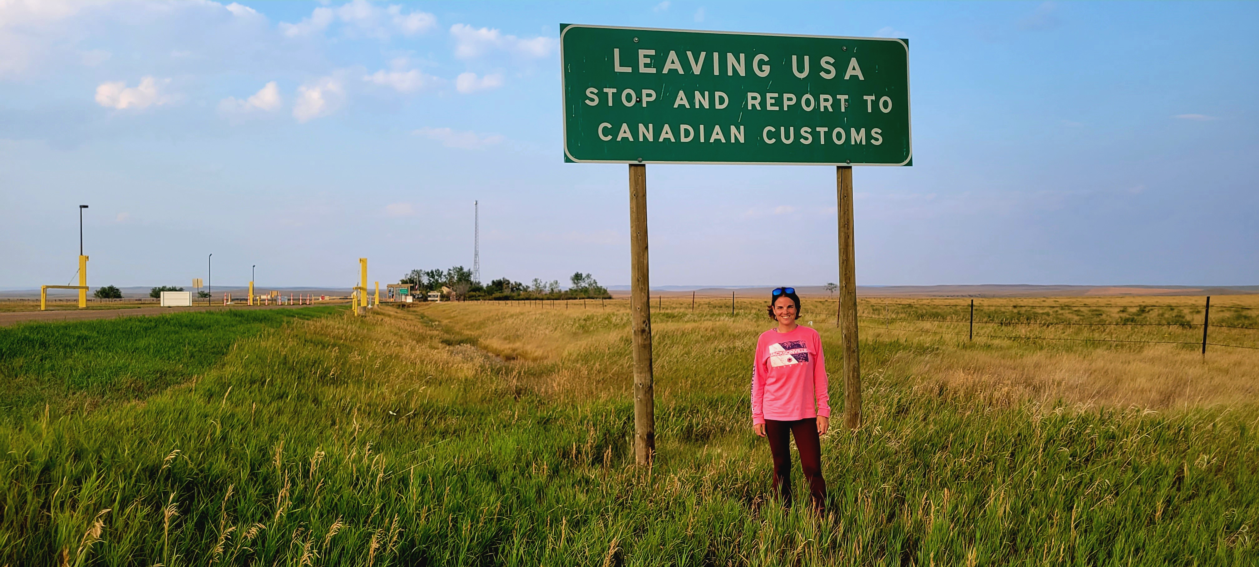 We see deer by Ophiem on our way to the Canadian border near West Poplar, SK. We also passed sheep and one of them appeared to temporarily be a tapir on a vacation high north from home in South America. We get to the border and an agent drives up, on his way to work across the parking lot, to tell us not to go under the gate, eh. We let him know we wouldn’t be going that far and he said that was fine.