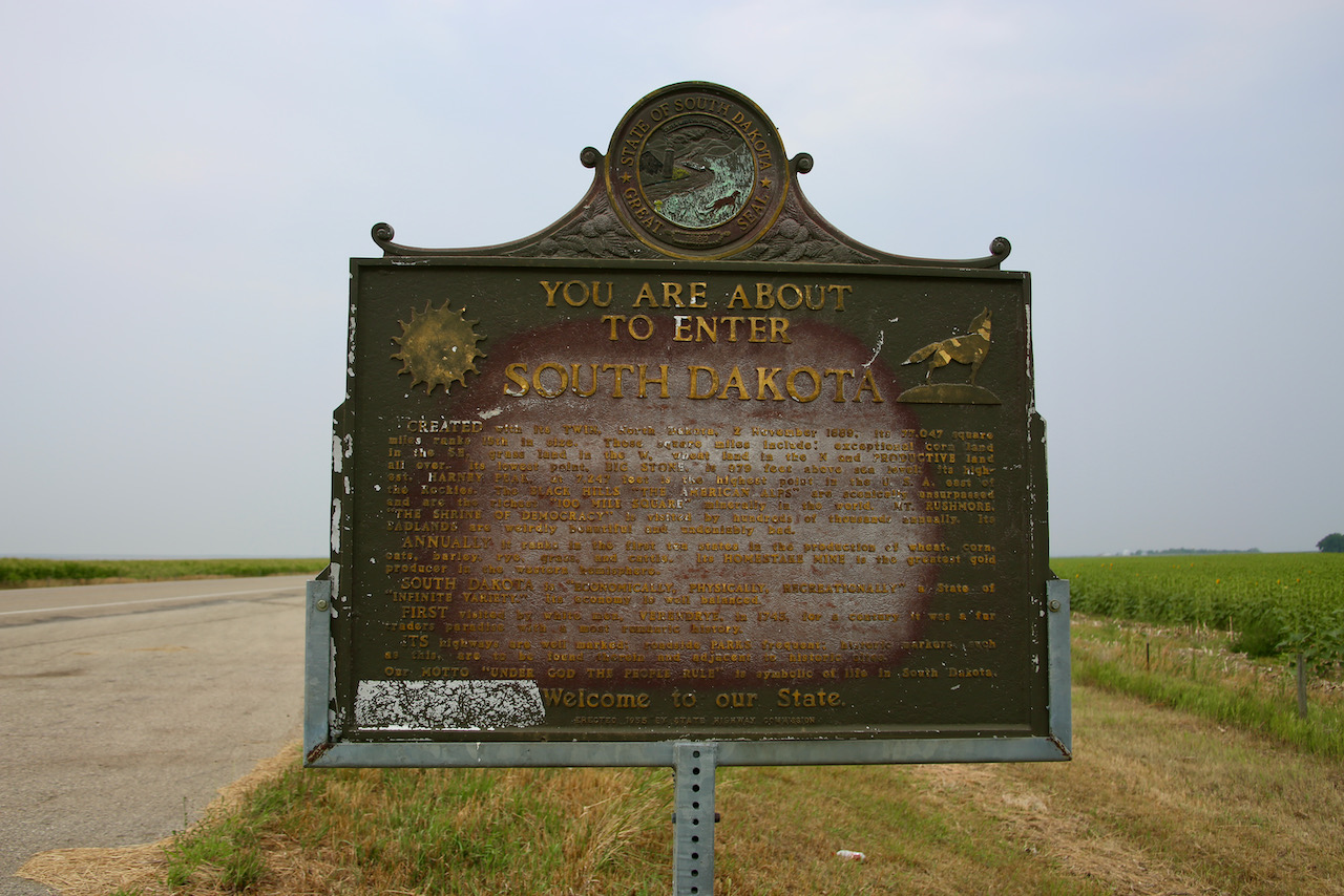We enter South Dakota after 6pm. The windshield wipers are garbage, which isn’t so bad when it’s not raining grasshopper guts too and they’re getting smeared all over the glass. We pass through Mound City, population 71, and Dad calls Caroline. It’s nice to hear a supportive voice looking at the map as I am so she can see where we are, which is near Pierre, the second-least populous state capital where we will be having dinner.
