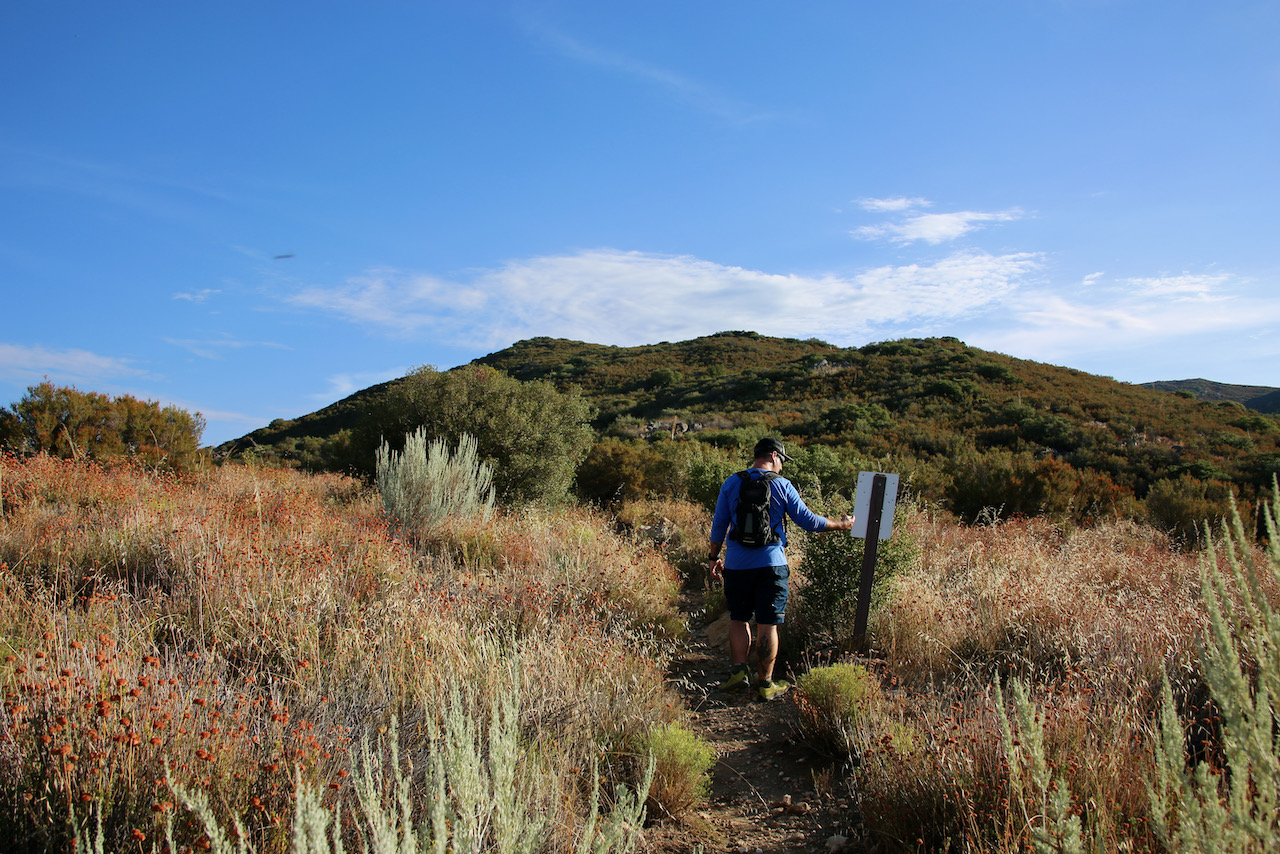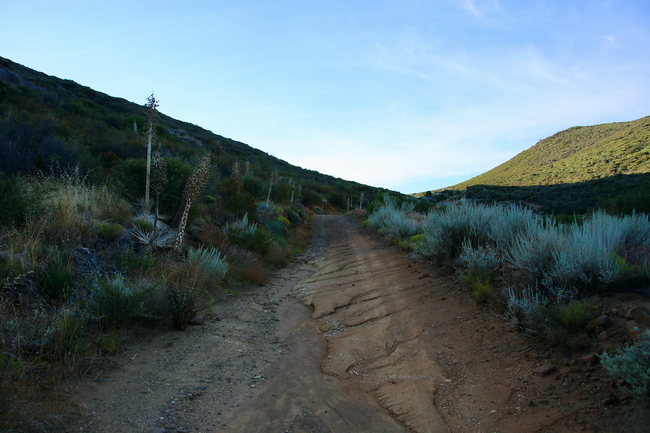 The morning starts off cool, around 61 degrees, and the ascent is constant. We’ve got long sleeve shirts on to protect against the sun but they won’t make it on our backs for the length of the hike. We walk through the small opening in the fence from the campground that leads to a dirt road that will take us to a good break point in the trail. There is some shade and rocks for resting and stretching.