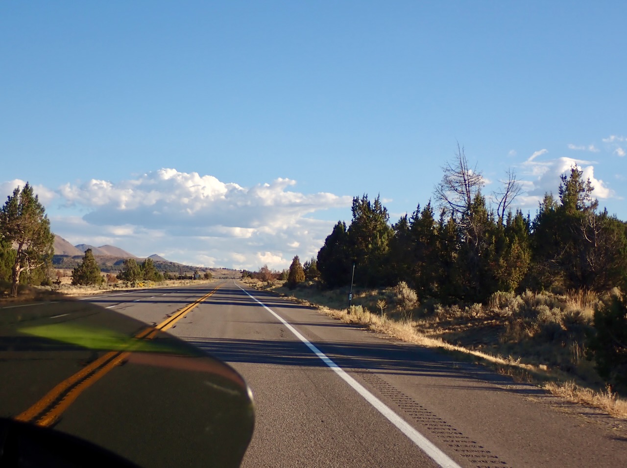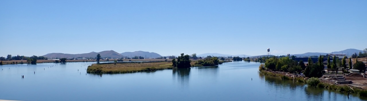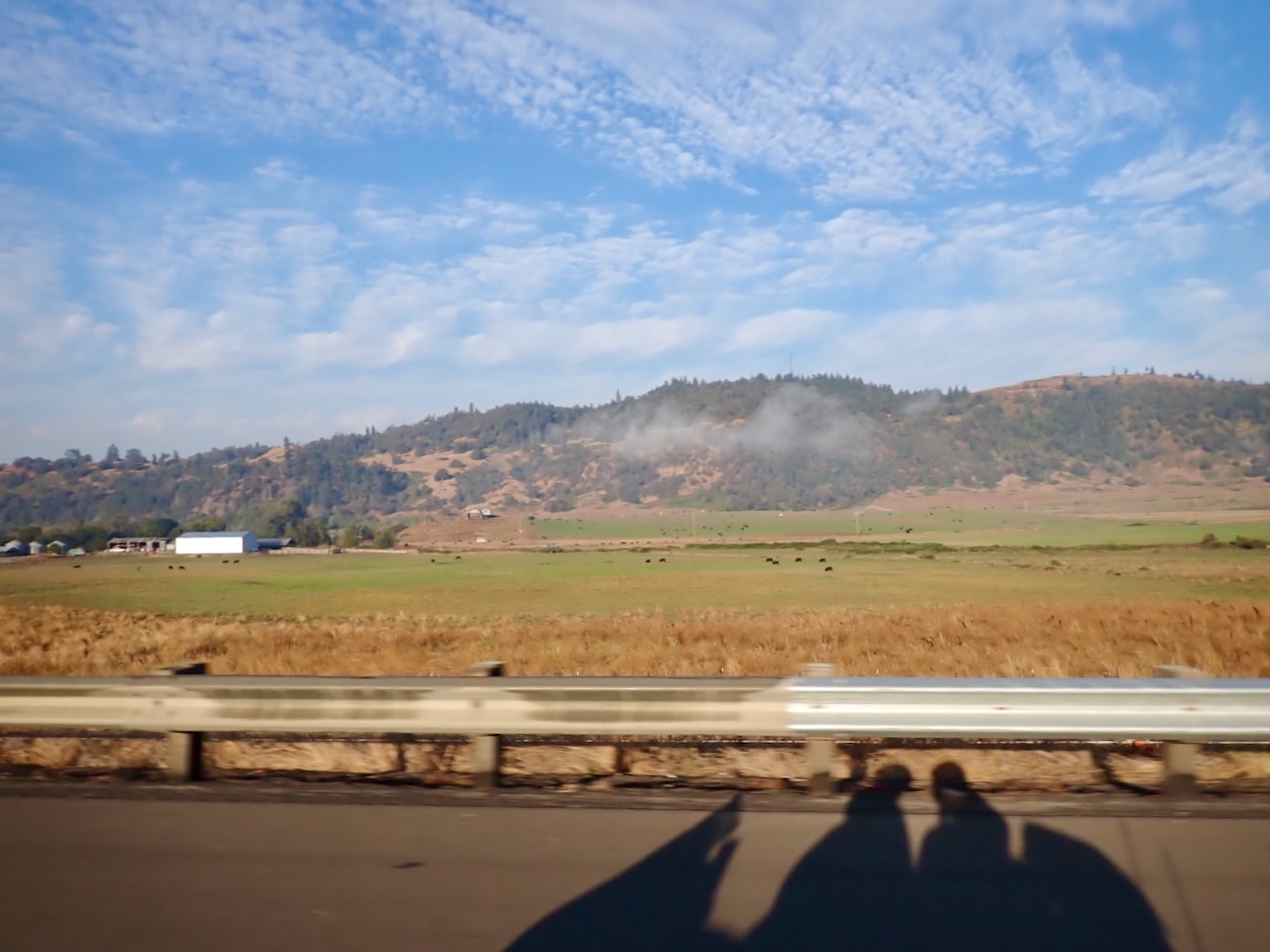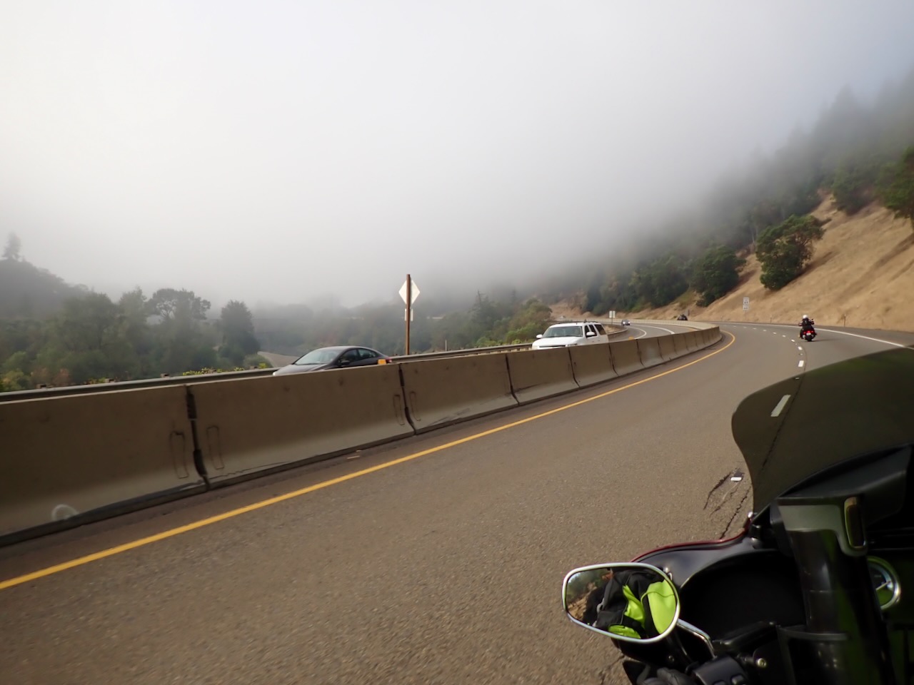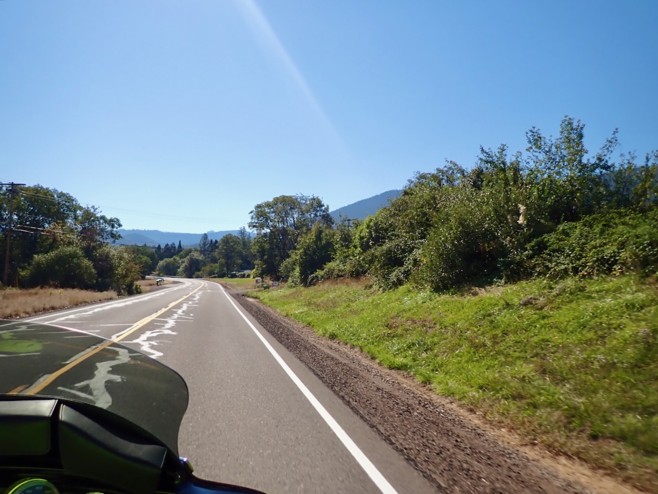 We sleep in and are on the road in a foggy 52°F this morning, which is better with all this gear on than the 82°F yesterday afternoon. We stop for brunch at Oak Tree NW in Ashland, OR, before getting on the smaller and windier roads that will take us through parts of southern Oregon, the eastern side of northern California, and into a corner of Nevada. We stop in Merrill, and I take off my hoodie and coat liner and open my jacket and pant vents. When we stop in Alturas around 3pm, I’ll take my pants off from under my padded pair at the gas pump.