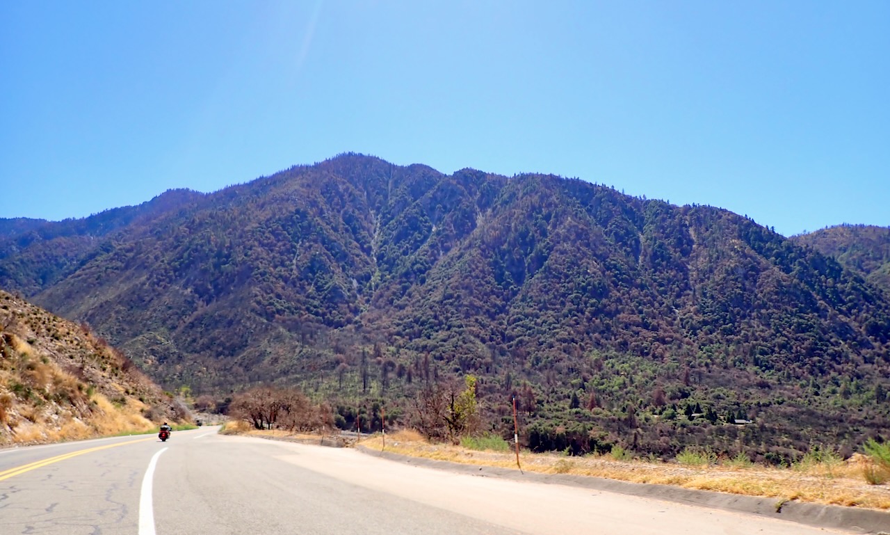 Ed uses his seniority to turn on all the lights and make noise when he gets up, which wakes Caleb. I can usually wake someone just by being in the same room or building. We pack the bikes by 730 am and have breakfast at a cafe in Lucerne Valley. We continue on the east side of Big Bear and have to wait in the road while a dump truck gets winched off its side around a turn near Angelus Oaks. We turn the bikes off to avoid overheating, and once cleared, enjoy the breeze of movement south through Hemet, Pala Mesa, and Ramona.